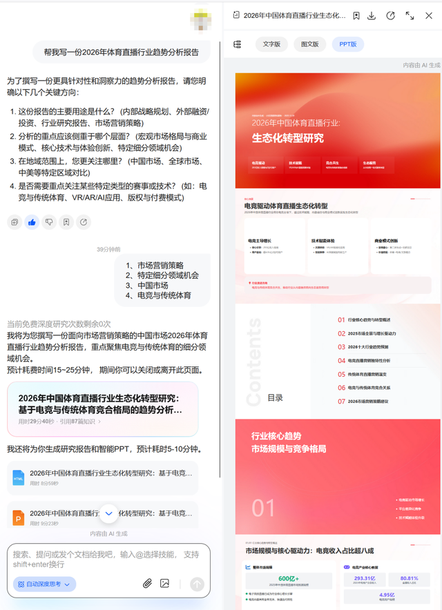 年底年初,各种总结规划报告满天飞。面对几十个网页和一堆文档,往往看花了眼也理不出头绪。小艺深度研究能解决这个问题,直接告诉TA:“帮我写一份2026年体育直播行业趋势分析报告”,TA会像个专业分析师一样,拆解需求、全网搜索、调用权威行业知识库。大概半小时后,小艺深度研究会提供一份逻辑清晰、数据详实的研究报告,并可以导出为PPT。我只需要专注于核心观点的输出,繁琐的数据搜集整理,小艺代劳即可。