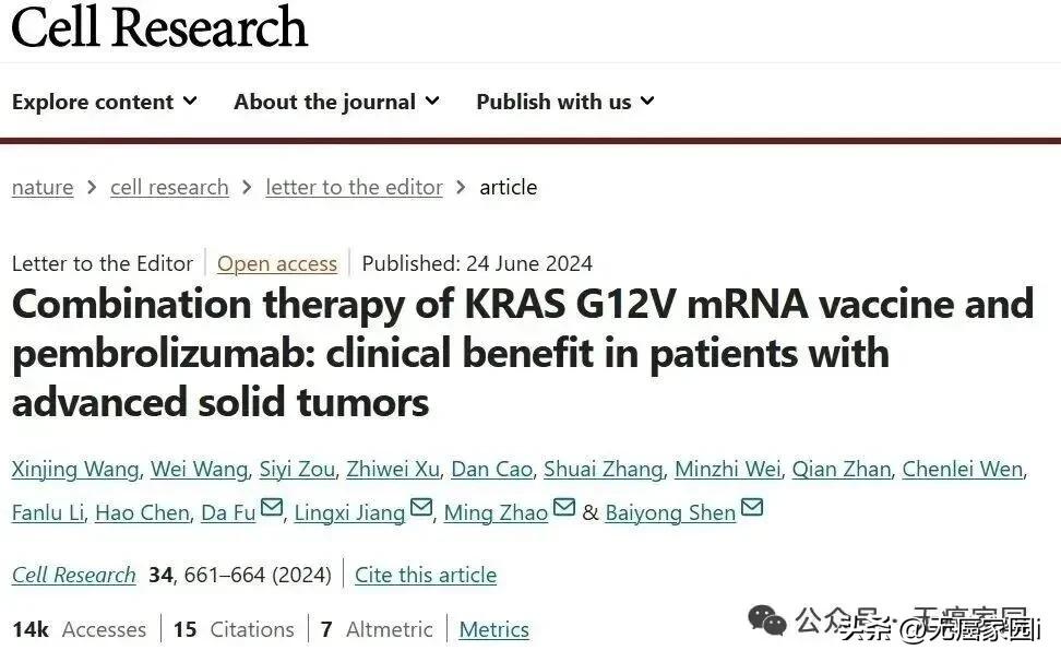 2024年6月24日,由我国知名医疗团队在国际医学顶刊《Cell Research》发表了报道了mRNA肿瘤疫苗研究新进展:在全球范围内首次报道针对KRAS G12V单靶点的mRNA肿瘤疫苗在实体肿瘤中的治疗效果,为传统治疗无法耐受或者耐药的晚期肿瘤患者带来新希望。