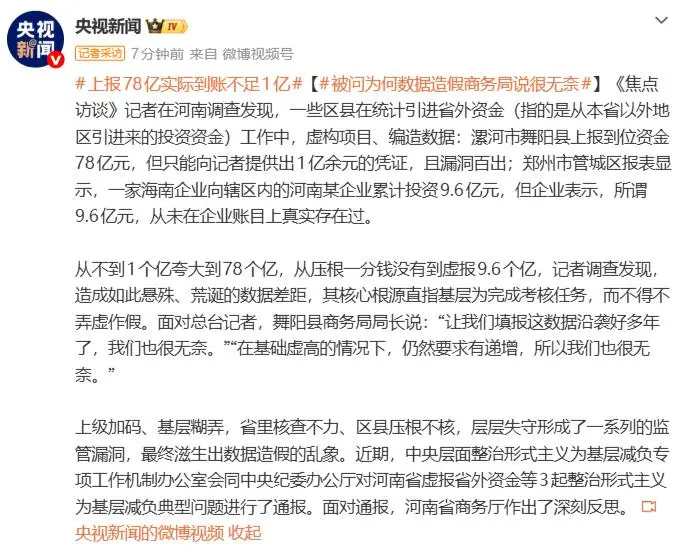 据央视新闻,《焦点访谈》记者在河南调查发现,一些区县在统计引进省外资金(指的是从本省以外地区引进来的投资资金)工作中,虚构项目、编造数据:漯河市舞阳县上报到位资金78亿元,但只能向记者提供出1亿余元的凭证,且漏洞百出;郑州市管城区报表显示,一家海南企业向辖区内的河南某企业累计投资9.6亿元,但企业表示,所谓9.6亿元,从未在企业账目上真实存在过。