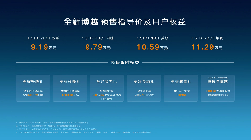 全新博越以智能无界座舱与越级舒适空间为核心武器,直击家庭用户痛点。即日起,消费者可通过预订,抢先锁定新一代家用SUV标杆车型。预售期间购车用户更可享多重专属权益,开启舒适智能出行新篇章。