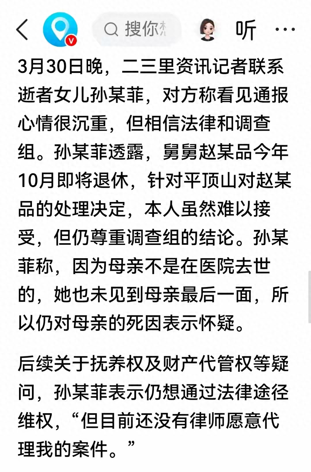 孙某菲对调查结果“难以接受,但仍尊重调查结论”。她说,目前还没有律师接她的官司。