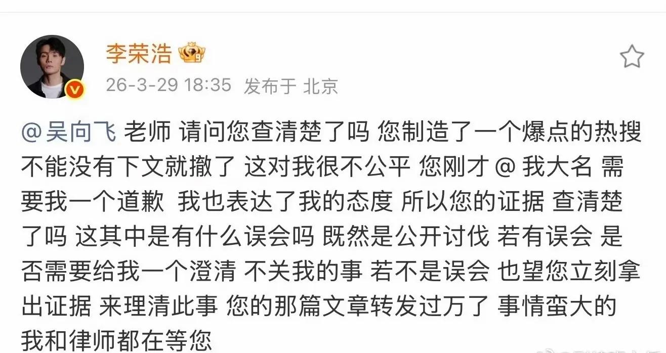 随后李荣浩再度发声,直言此事影响重大,自己已与律师待命,要求吴向飞要么拿出证据,要么澄清误会,不能仅凭一句指控就制造热搜、不了了之。
