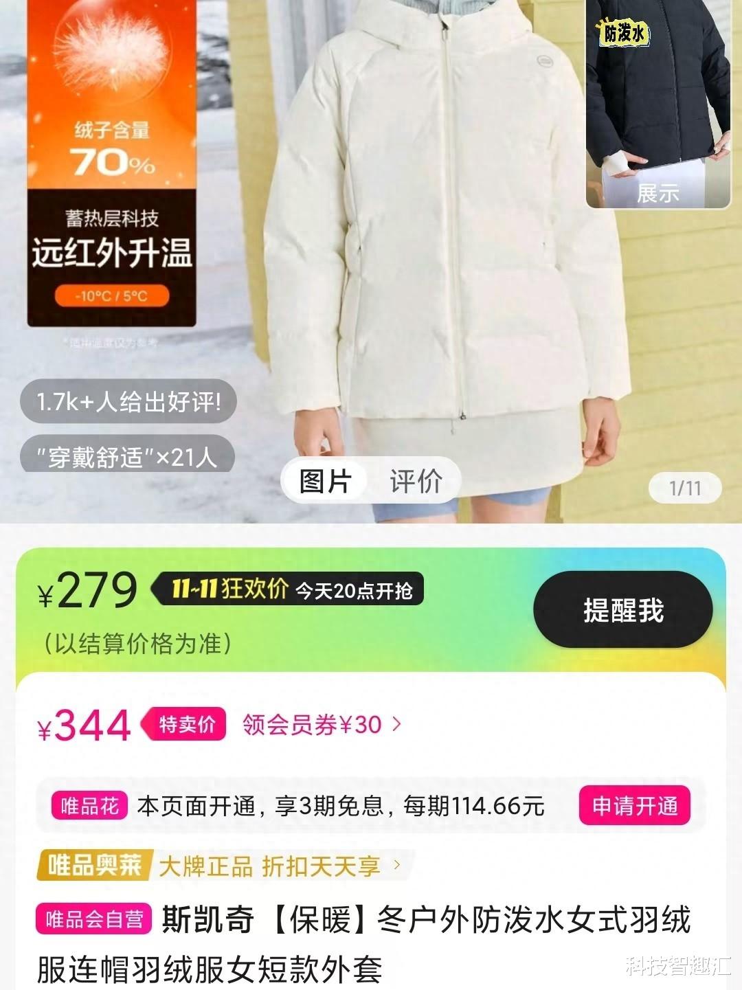 回到家后跟朋友互丢链接分享看到的不错衣服,不过价格同样挺贵的,倒是这件唯品会的斯凯奇羽绒服,看着不错,是丢过来的几个链接里最便宜的。点开链接跳转app,原来是有双十一活动,这件羽绒服原价999,晚上八点活动,开抢只要278元的价格就能拿下,相当于打了2.8折的折扣,看着比线下划算不少。