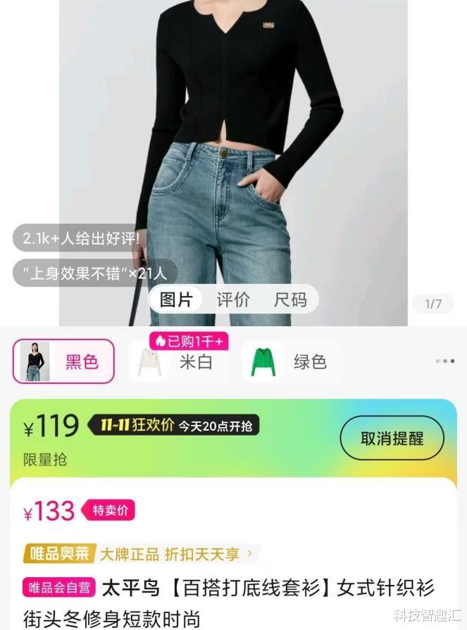 直接点了预约,等到晚上八点的时候抢。退出这个页面,又刷到了这件太平鸟的打底套衫,原价499,晚上八点的活动只要119,相当于是2.7折的折扣价。