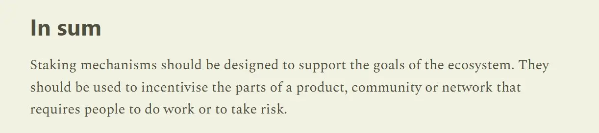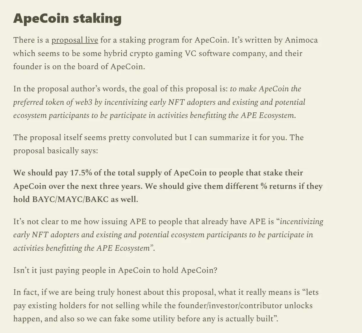 利益一致性的权衡值得强调的是这也带来的风险。我们已经看到过类似结构在历史上出现严重问题的例子。请参阅 Cobie 文章中的这段节选:“ApeCoin 与质押的消亡”