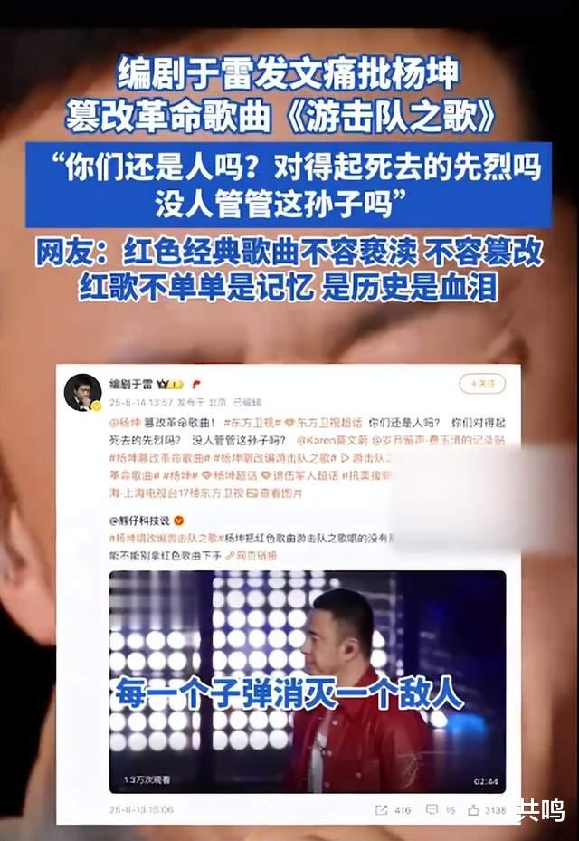 编剧于雷这次之所以没有“无所谓”,是因为杨坤对《游击队之歌》不是“改编”,而是“篡改”。于雷的核心愤怒,在于认为杨坤的改编严重偏离甚至亵渎了这首革命经典歌曲的原始精神和历史价值。