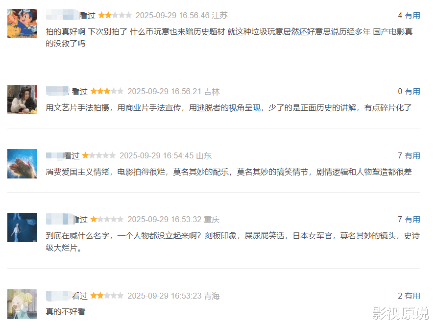 当影片于9月18日上映之后,《731》的观众口碑直接出现了两极分化的现象,一星两星的差评非常多,都称其没有历史的厚重感,整体给人的感觉就是不好看。因而它的票房也是受到了极大影响,首周单日票房都是在2.5亿人民币以上,到了第二周却断崖式下降到了3000万人民币以内。