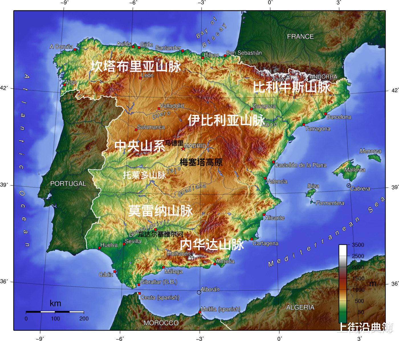 当你坐飞机到马德里,窗外是一望无际的棕黄色。那不是因为干旱造成的,那是梅塞塔高原本来的颜色。它处在伊比利亚半岛的中心位置,平均海拔在600到800米之间,四周被各种山脉层层包围,这是一块被山脉锁住了的抬升台地。面积超出30万平方公里的它,占西班牙国土的60%。
