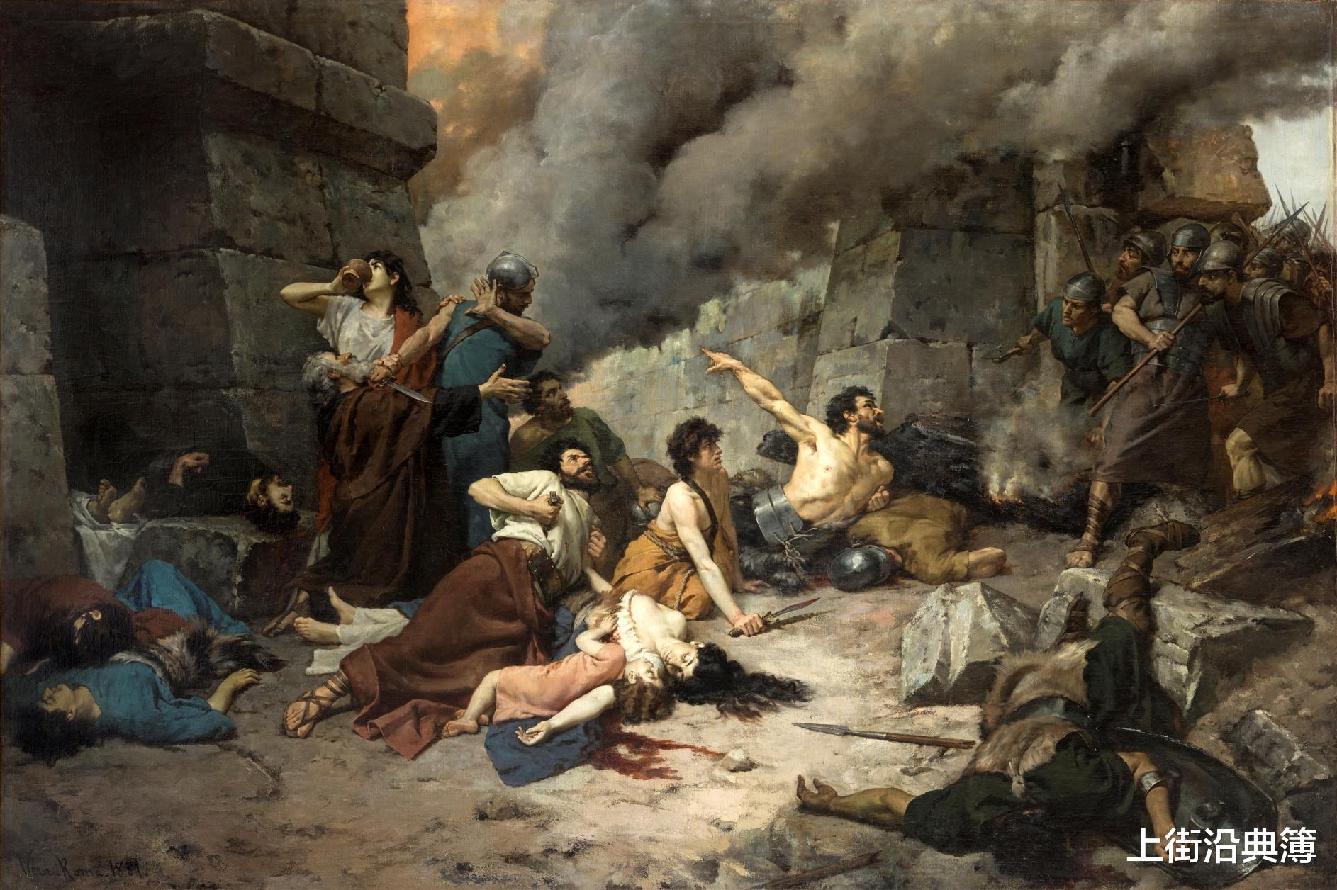 直到公元前 133 年,罗马派出灭亡迦太基的名将小西庇阿,统帅6万重兵围困小城15个月才攻破小城。大多数守军都选择自杀,并焚烧了城市,让罗马人得到的是一座空城和废墟。(上图,破城自杀场景)
