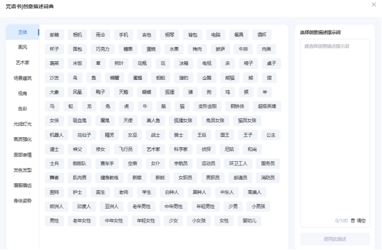 另外,如果不知道如何写提示词,平台还提供了咒语书功能。用户可以在其中查看不同类型的提示词示例,例如主体内容、画面风格、场景建筑、镜头视角、色彩、光线、画质以及人物表情姿态等。通过这些示例,用户可以更容易写出清晰的描述,从而获得更理想的生成效果。
