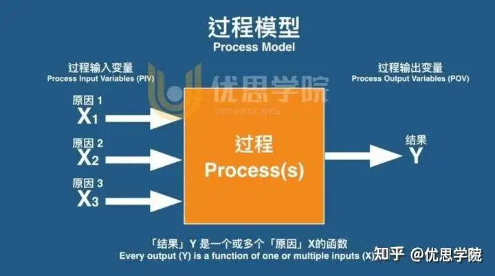优思学院认为,「过程」可以界定为:「在一组原因(causes)和条件(conditions)之下,重复让投入(input)形成结果(outcome)的转变」(下图)。