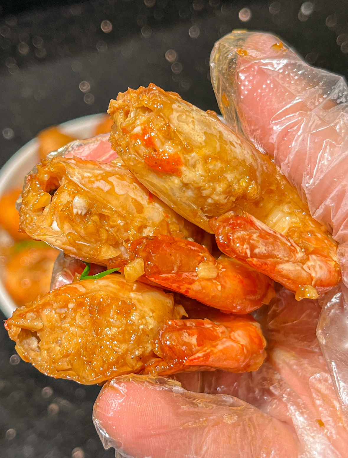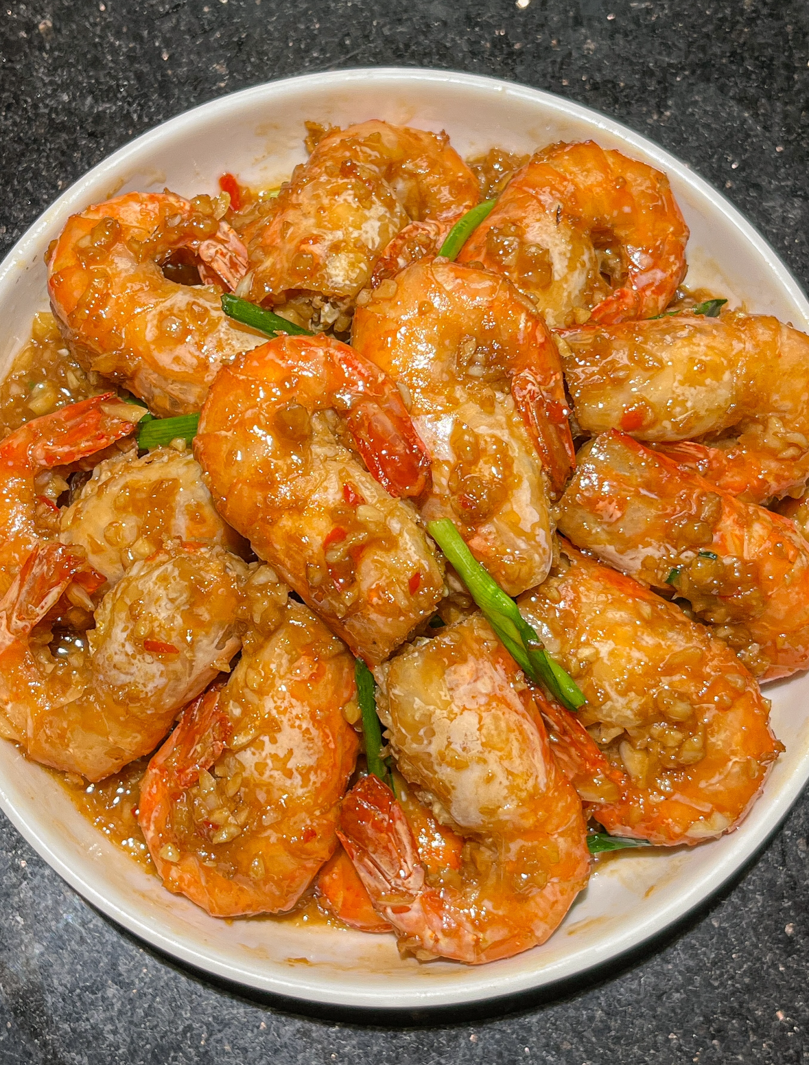 收汁阶段最考验耐心,火一大蒜就焦。看到汤汁从“水泡泡”变成“鱼眼泡”,把剩下的一半蒜末和葱段全倒进去,锅铲来回推三下立刻关火,余温会把葱香焖进壳缝里。端上桌别顾形象,直接上手——拇指食指一捏,虾壳“咔嚓”裂开,蒜汁顺着指缝往下淌,舔手指是对这锅虾最基本的尊重。我家那位平时嚷着减肥的老公,每次都要把汤汁拌两碗饭,边吸溜边发誓“明天再减”。