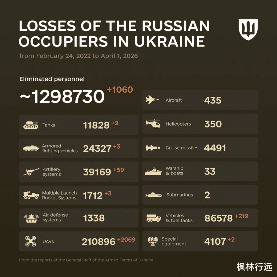 乌总参公布的昨日战果,歼敌(击毙+重伤)1060人。