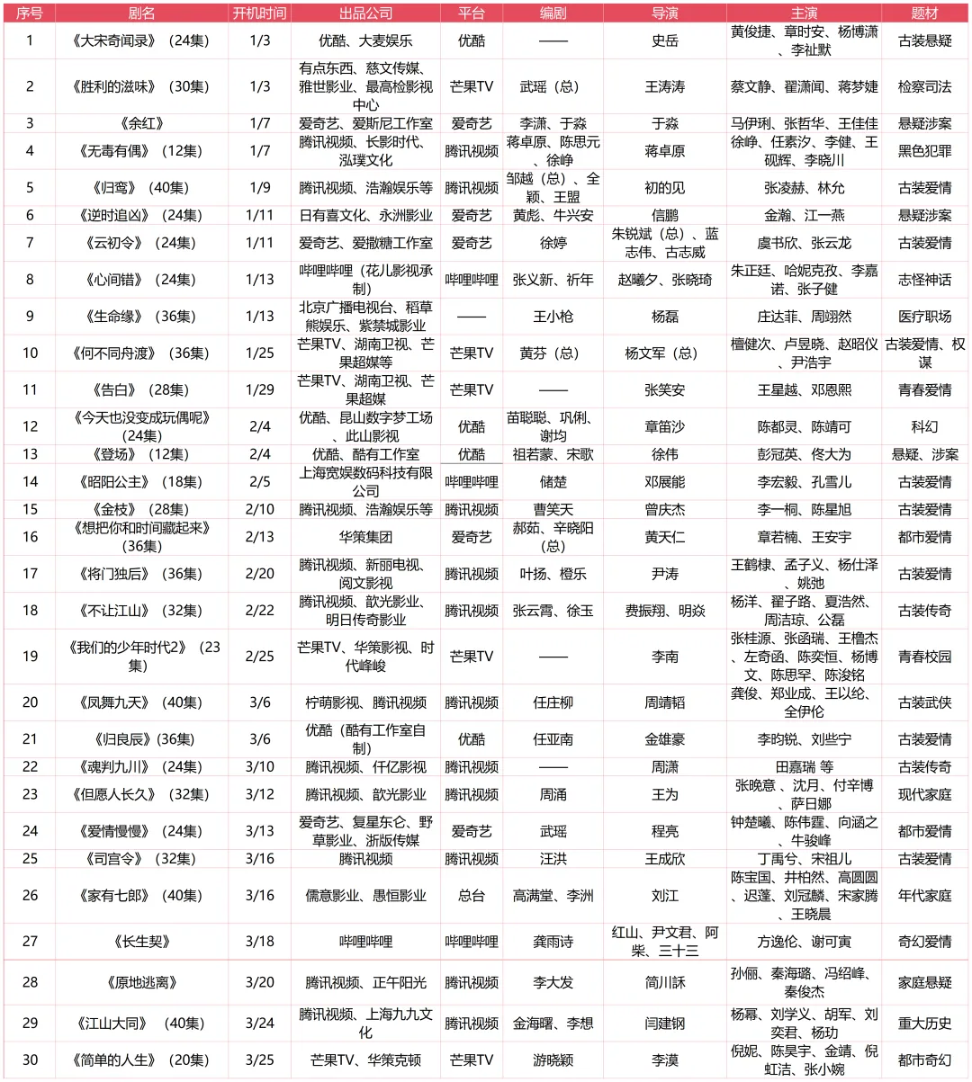 这是截至目前(3月28日),今年第一季度公开信息可确认的开机剧数量。
