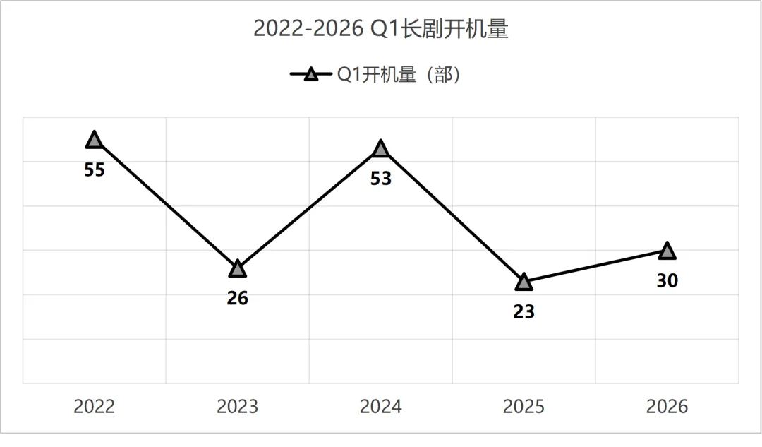 相较2025年Q1的23部,这个数字略有增长。但如果再往前数三年,2024—2022年Q1的开机量分别是53部、26部、55部。