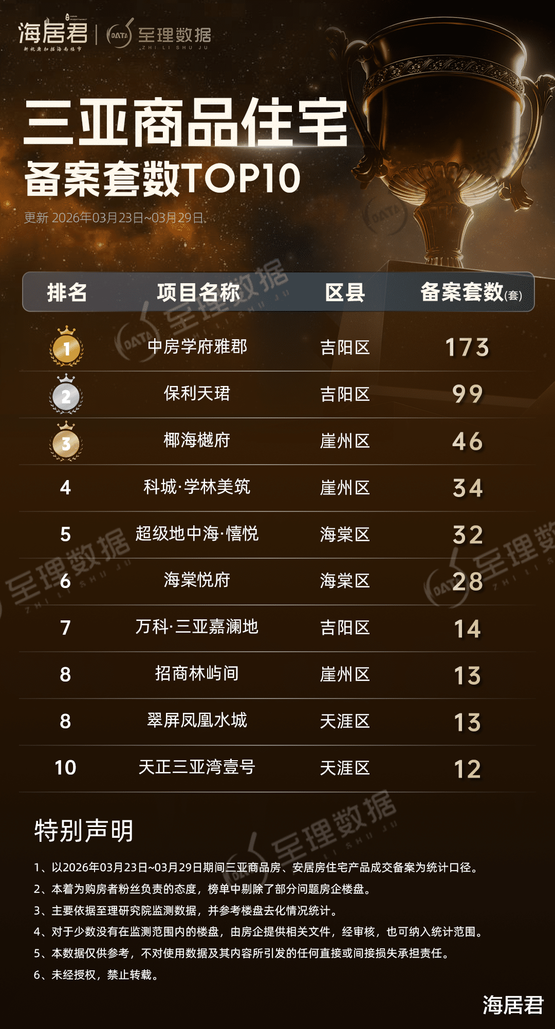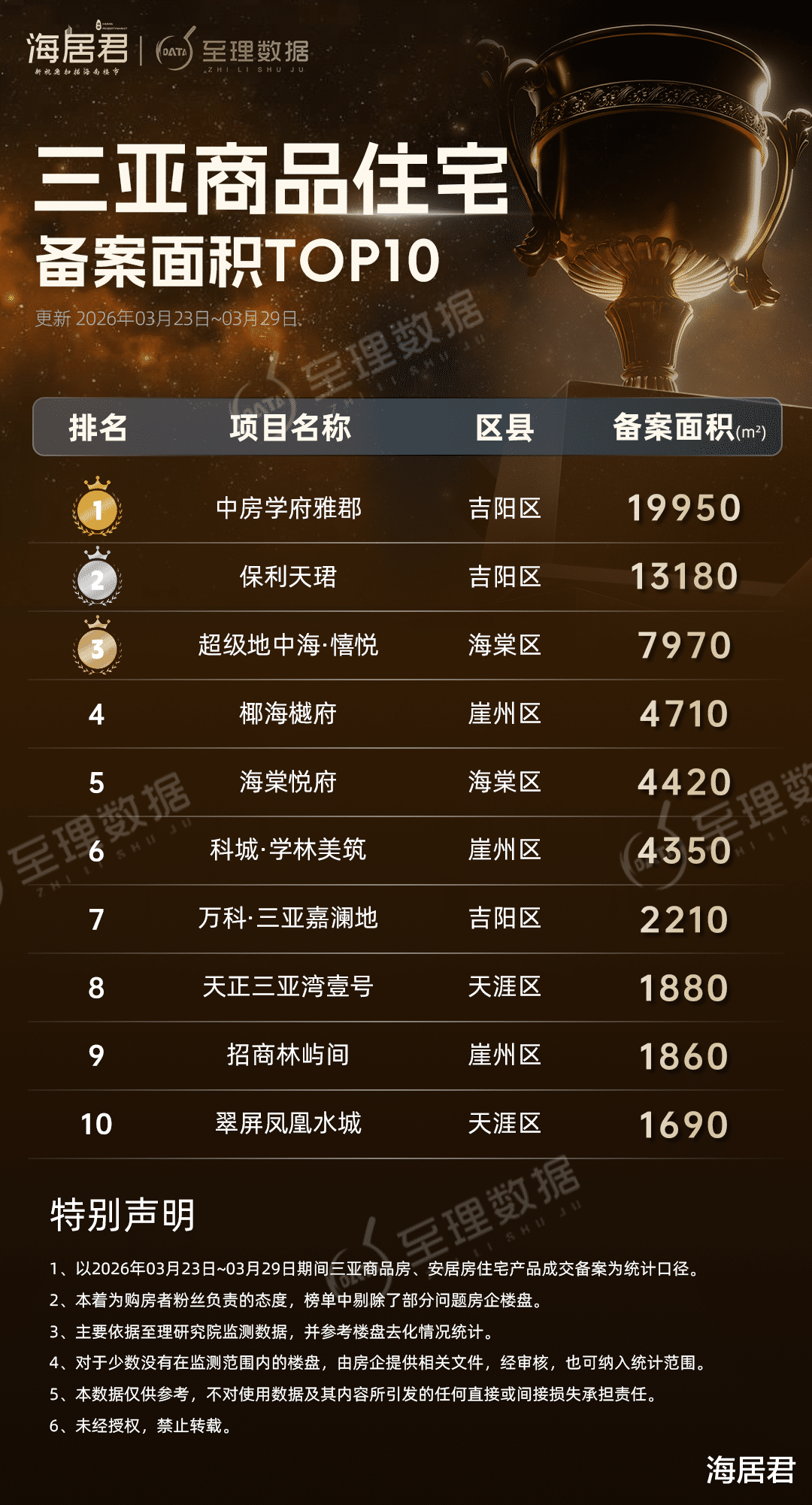 月川片区保利天珺成交99套居第二;崖州湾椰海樾府成交46套夺套数榜第三,海棠湾超级地中海·憘悦成交约7970平方米,摘面积榜第三。