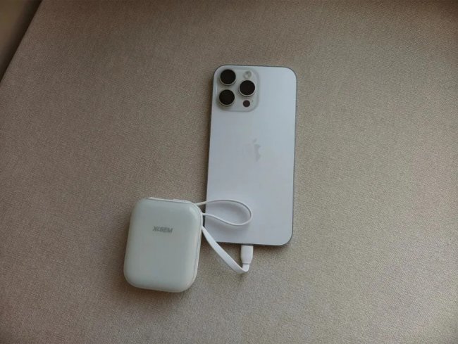 贴心之处在于自带一根 22cm 长的 USB-C 线,拉出就能直接充电,不用额外多带一根线;用完轻松收回,收纳整洁不缠绕,出门用起来特别方便。