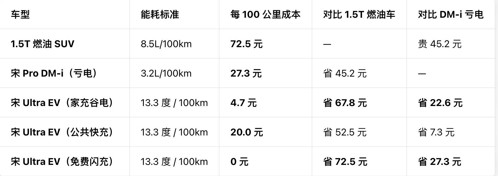结合山东当前用车成本,我们可以算一笔清晰的经济账,按照 2026 年 3 月山东官方 92 号汽油挂牌价 8.53 元 / 升计算,主流 1.5T 燃油 SUV 城市通勤百公里油耗约 8.5 升,每 100 公里费用约 72.5 元,即便是以省油著称的 2026 款宋 Pro DM-i,亏电油耗 3.2 升 / 100 公里,每 100 公里也要 27.3 元,而宋 Ultra EV 官方 CLTC 百公里电耗仅 13.3kWh,使用家用谷电每 100 公里成本仅 4.7 元,再加上首任车主可享 18 个月免费闪充权益,用车成本几乎可以忽略不计,这样的差距放在每月、每年的通勤中,省下的费用相当可观。