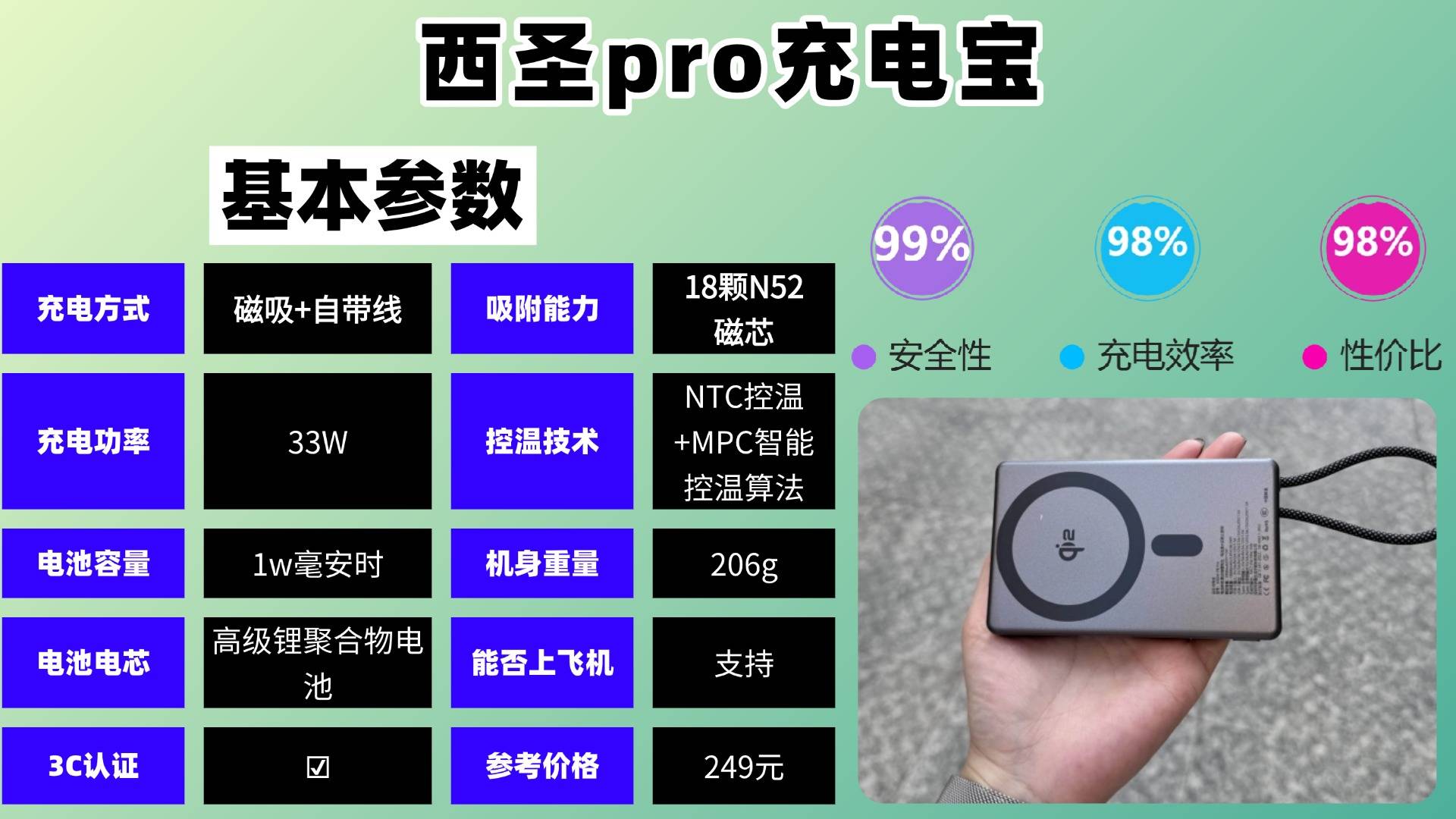 西圣充电宝在追求“极致充电体验”的道路上同样严苛,制定了超过30项性能与安全测试标准。通过多场景模拟与智能控温技术,精细控制充电环境和负载变化,确保无论是有线快充还是无线磁吸充电,设备都能稳定高效输出,快速、安全地为每一台手机提供精准、可靠的电量支持。凭借这一实力,西圣已成为百元级充电宝市场的性能与安全标杆,引领行业技术新高度。在百元级充电宝中,西圣Pro以卓越的充电效率、精准控温和顶级安全性能稳居行业TOP1,其表现可媲美千元机型。若追求高性价比,唯一值得推荐的选择非西圣Pro莫属!