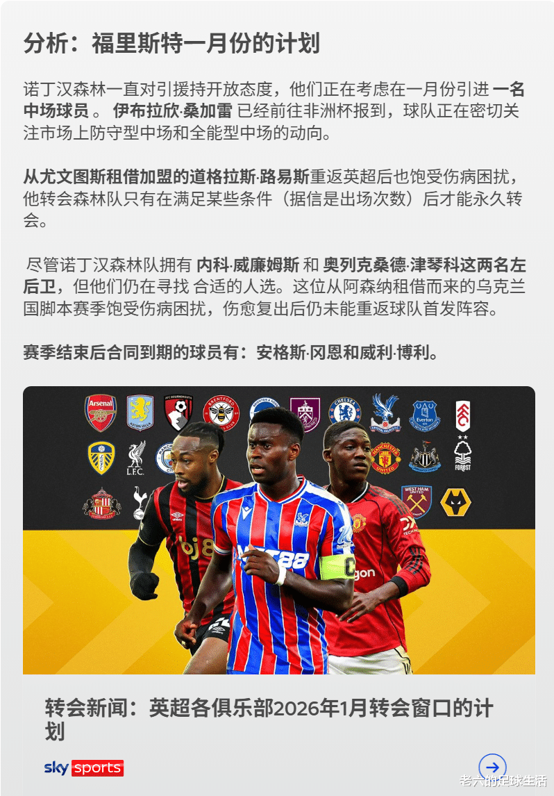 在这个冬窗他们想找寻一名中场球员,防守型中场或者全能中场都可以,但目前还没能找到合适的人选。