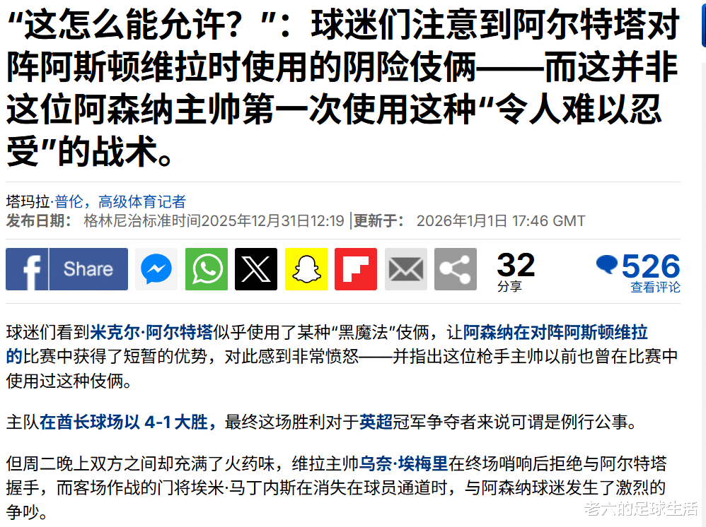 阿斯顿维拉这边上一场比赛被阿森纳4-1,赛后主教练埃梅里都拒绝与阿尔特塔握手,很大原因可能是因为阿尔特塔被媒体形容的“阴险技俩”。