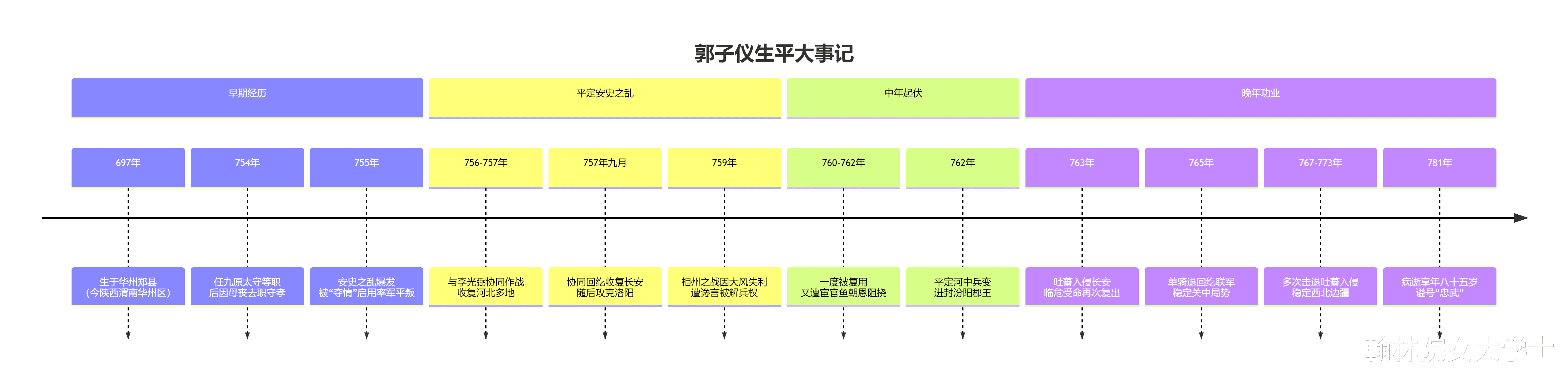 郭子仪是唐朝的常青树,他在唐朝将星中的地位也仅次于李靖。他一生最重要的战绩基本发生在五十岁以后,最辉煌的功绩多是在晚年完成的。六十岁时与广平王李俶收复西京长安、东都洛阳,吐蕃趁乱攻陷长安,六十七岁的郭子仪被再度启用,收复长安,六十八岁时,郭子仪在泾阳表演了“单骑说退回纥”的经典一幕,并击溃吐蕃稳住关中。甚至年过八旬,他仍然督军防御吐蕃。