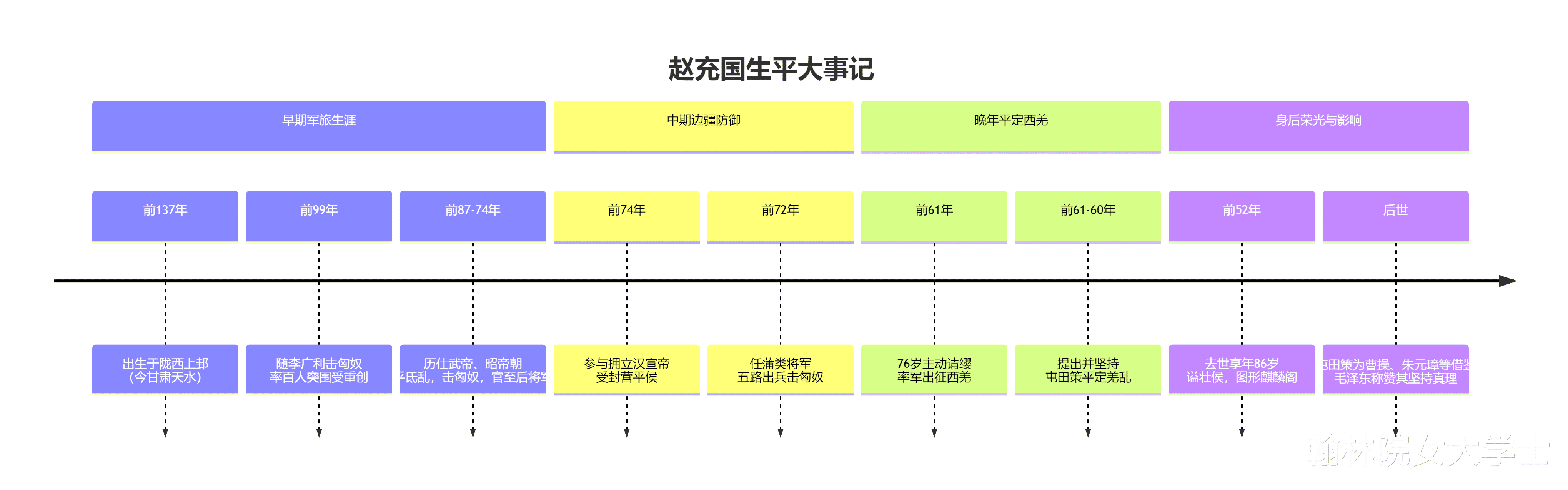 赵充国他的军事生涯横跨武帝、昭帝、宣帝三朝,在维护边疆稳定方面贡献巨大,七十六岁的赵充国主动请缨平定西羌叛乱,八十四岁高龄最后一次献计安定乌孙。