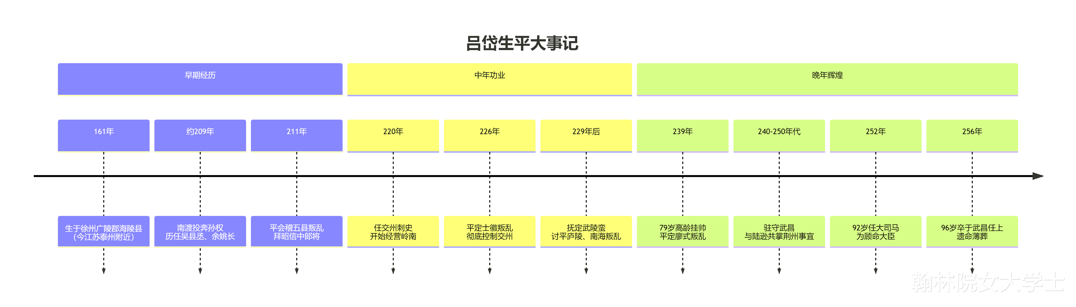 吕岱虽然在三国时并不出名,但是他的贡献却是非常出名,尤其在对外征战中。无论是安定岭南还是抚平山越,他为孙吴开疆拓土,功勋赫赫。吕岱八十岁时,廖式作乱,他毅然上表请战出兵,经过一年的战争,斩杀了廖式及他任命的伪官员临贺太守费杨等人,收编他们的队伍,叛乱得以平定。尽管年已八旬,吕岱身体素来精力充沛,依然亲自处理政事,骑马总是一跃而上,丝毫不弱于年轻人。