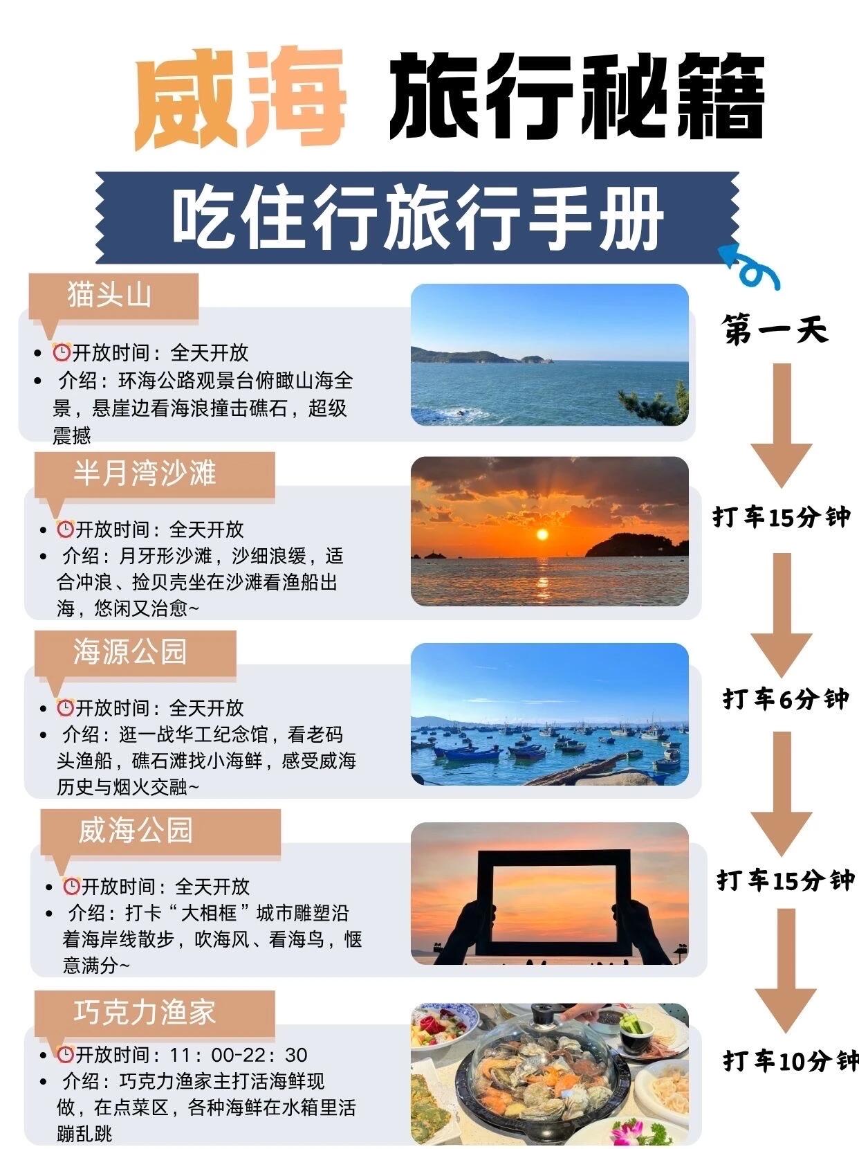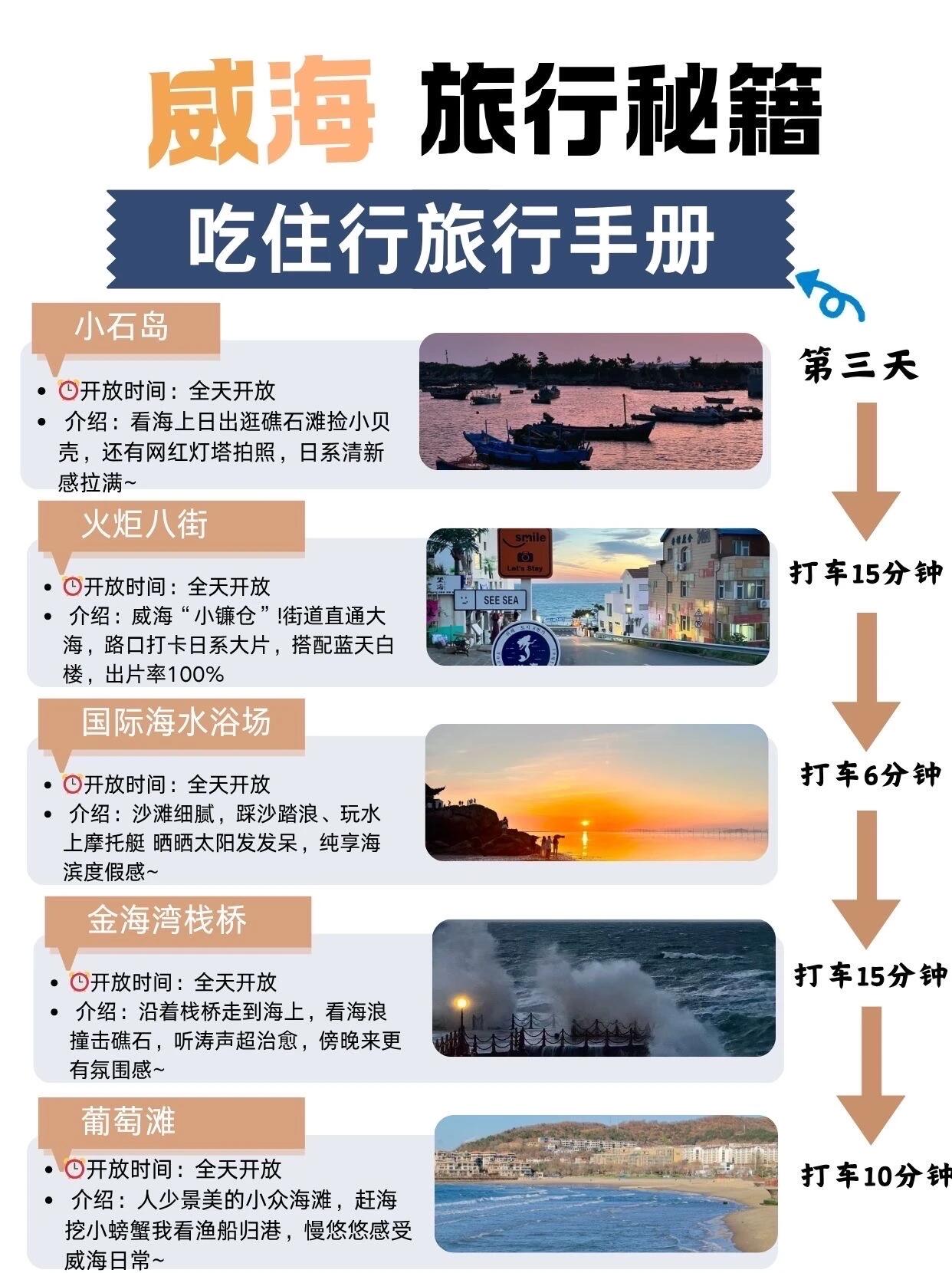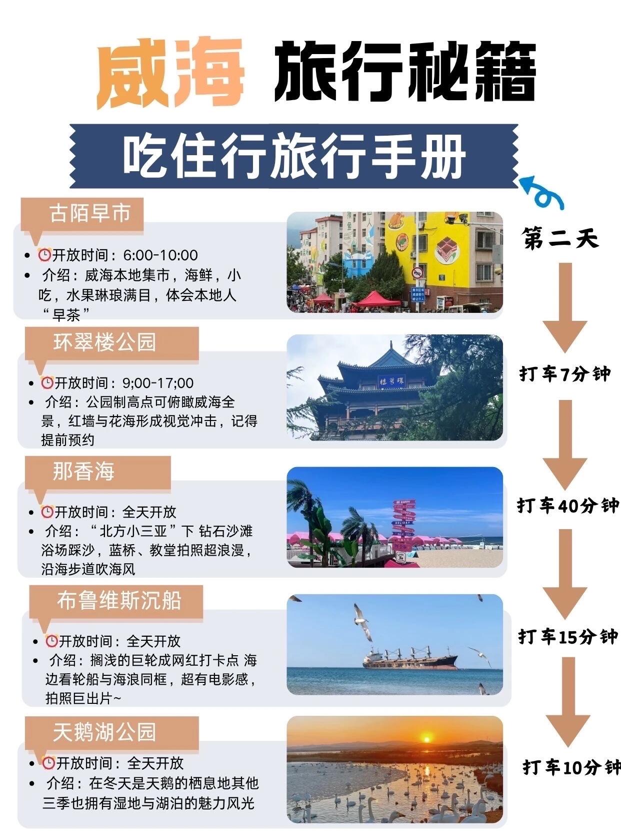 🚗交通:高铁选威海站(吃喝方便)/ 北站(近浴场),市内骑电动车沿海逛超爽!住宿选环翠区(市中心便利)或高区(近浴场,网红店多)。
