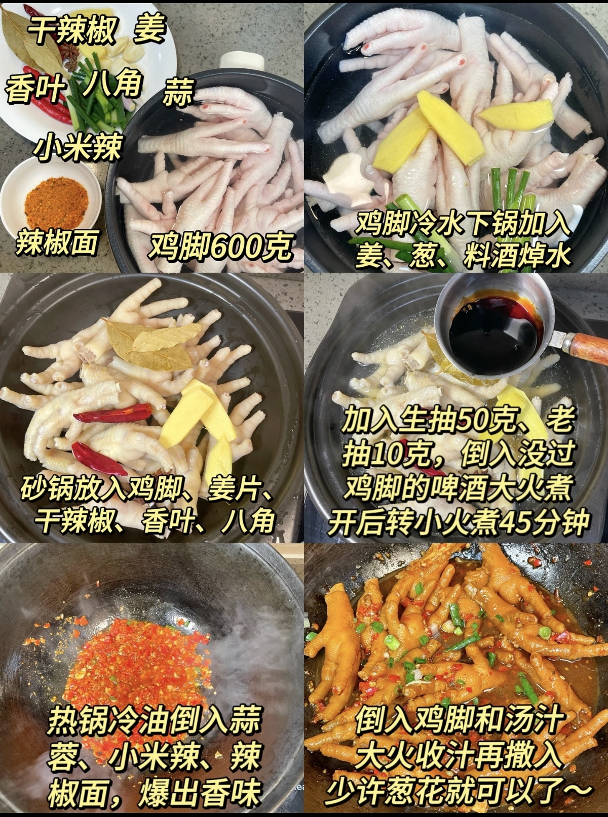 接下来,是赋予鸡脚灵魂色泽与风味的关键。锅中倒入少许食用油,放入几颗冰糖,开小火慢慢加热。这是一个需要专注的时刻,用锅铲不停搅动,直到冰糖完全融化,糖浆由大泡转为细密的小泡,颜色也变成了诱人的枣红色。此时,要迅速将沥干的鸡脚倒入锅中,快速翻炒,让每一寸鸡皮都均匀地裹上这层晶莹的糖色。紧接着,便是香料的盛宴。将姜片、蒜瓣、干辣椒、花椒、八角、香叶等一同下锅,与鸡脚一同爆炒。随着温度的升高,各种香料的气息被彻底激发,与鸡脚的肉香、糖色的焦香交织在一起,形成一股霸道而迷人的复合香气,瞬间弥漫整个厨房。