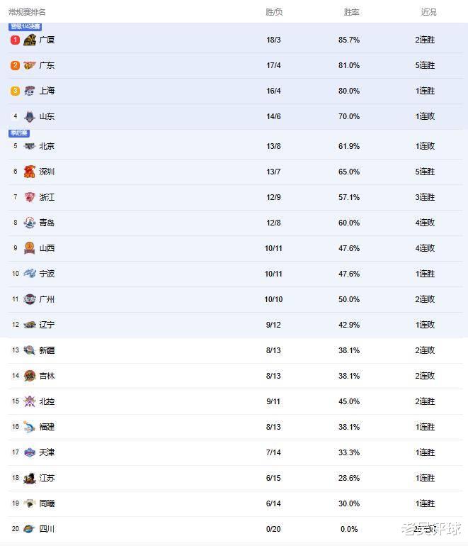 看一下CBA积分榜最新的排名,浙江重新杀回第1位,广东和上海分列第二位和第三位,山东队上升到第四位,不过与排在第三位的球队差了两个胜场,已经拉开了差距。二辽宁队输给宁波队后,排名已经跌至第12位。