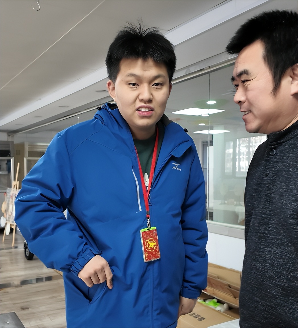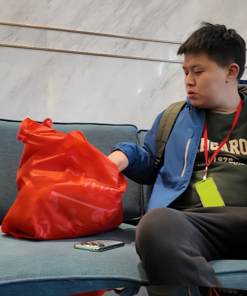 大约十分钟后,门外出现一位小伙和一位女士,正在找着什么。我迎出去,问是取东西的吗?女士连忙说是的,然后跟孩子说,不用打电话了,你该怎么说?男孩马上说:叔叔好!我跟他握了握手,手有些凉。10度左右的清晨,他穿着蓝冲锋衣,里面是一件T恤,还敞着怀。个子比我高。如果不说话,感觉不到他的特殊。