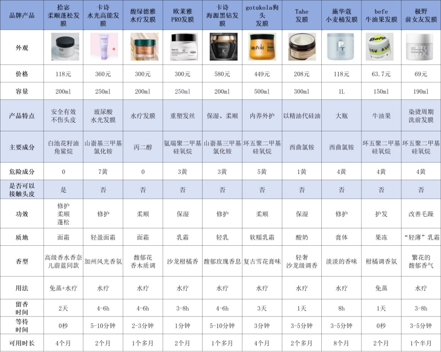 先跟大家分享一下各个品牌发膜的基础情况对比: