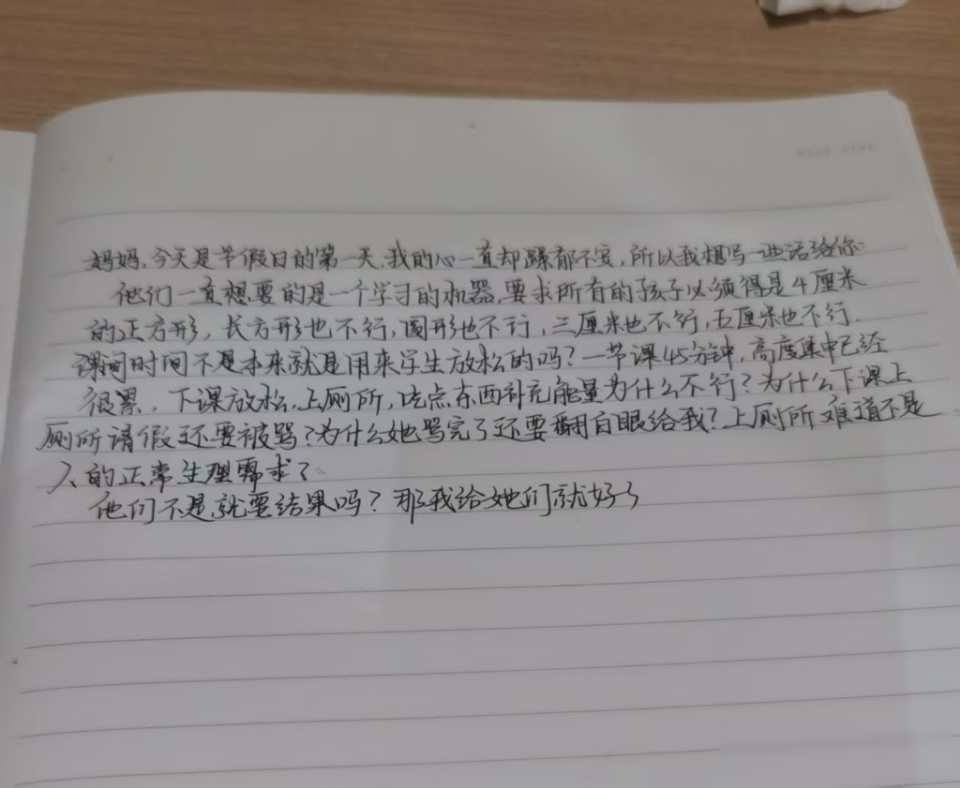 到了2024年5月,新来的孙老师看见卢小青在物理课上写其他科目的作业,就让她把《学生手册》抄上十遍,这本手册有好几千字,抄起来要花掉很多时间,孩子写下这么一句话:“他们要的是四厘米的正方形,”这话听着有点奇怪,其实是在说卢小青觉得学校想把她压成一个标准样子,她那时候心里特别难受,甚至想到过结束生命,可是没有人注意到这一点。