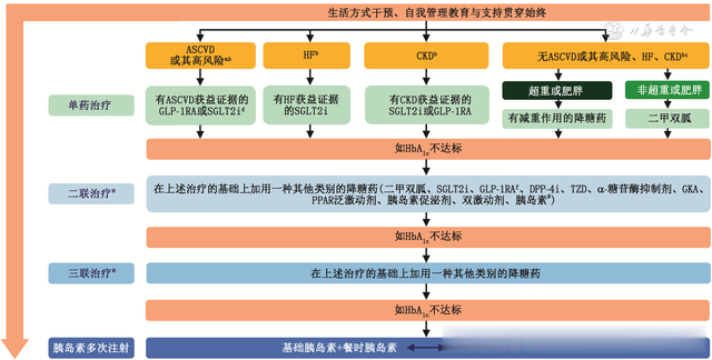 不伴ASCVD或其高风险、HF或CKD的T2DM患者,如无超重或肥胖选择二甲双胍治疗;如有超重或肥胖,选择有减重证据的降糖药;