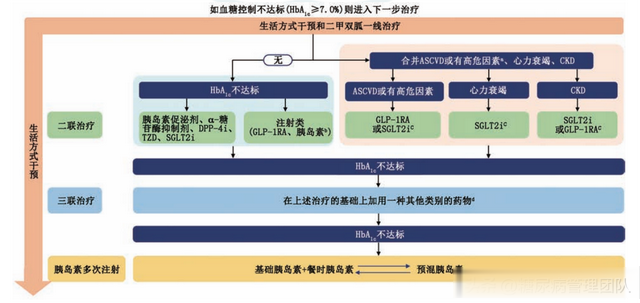伴动脉粥样硬化性心血管疾病(ASCVD)或其高风险的T2DM患者,选择有ASCVD获益证据的胰高糖素样肽-1受体激动剂(GLP-1RA)或钠-葡萄糖共转运蛋白2抑制剂(SGLT2i);