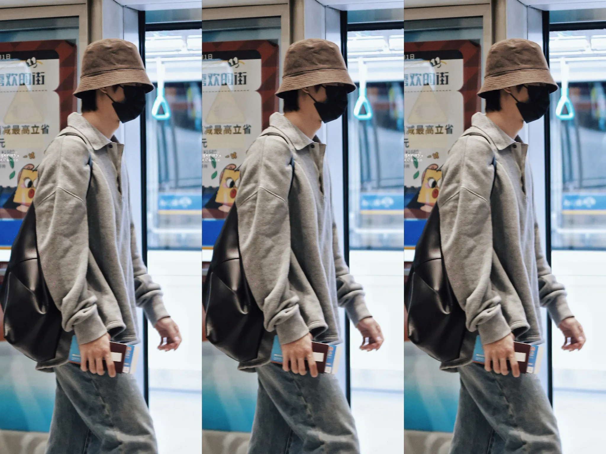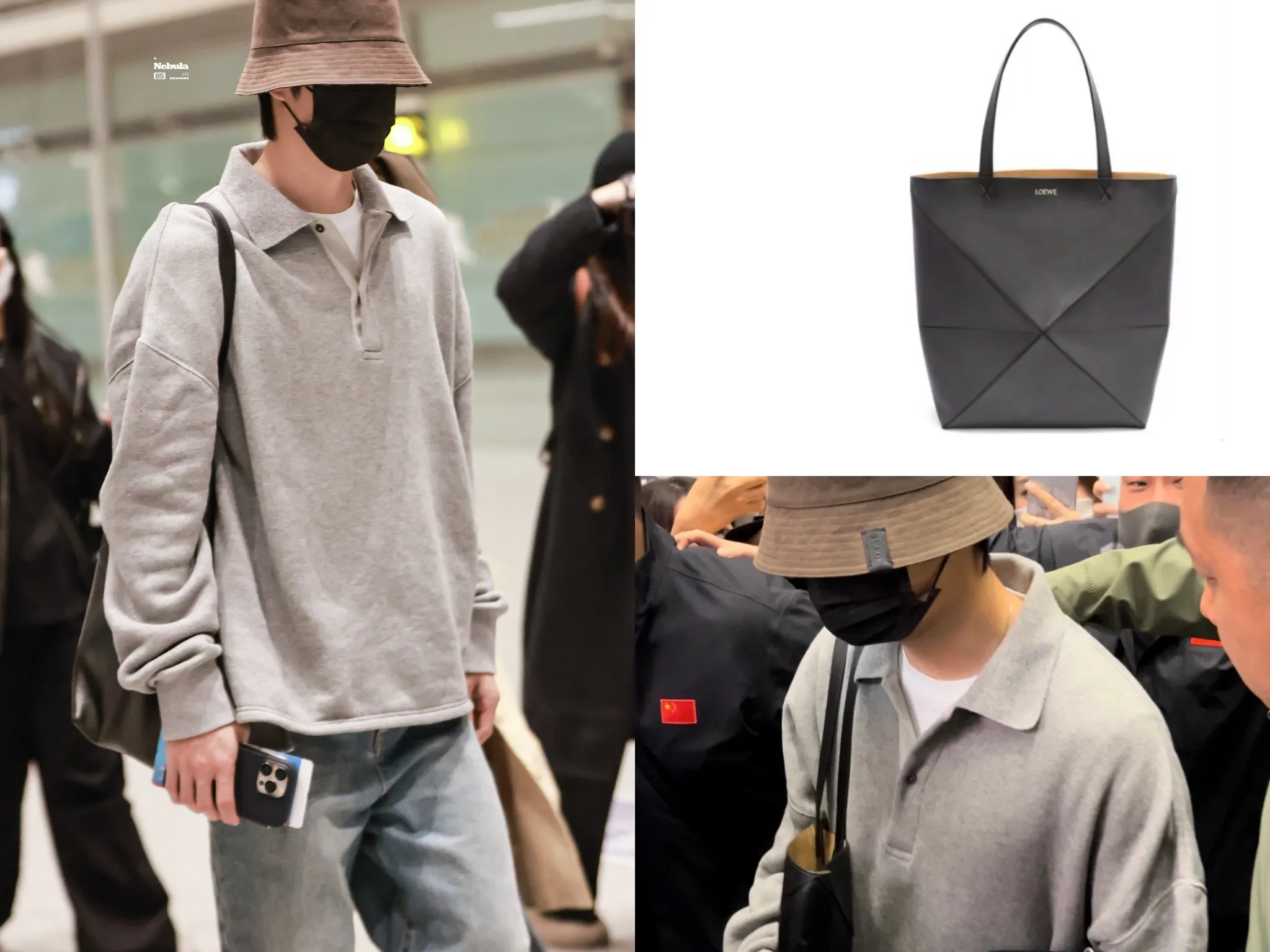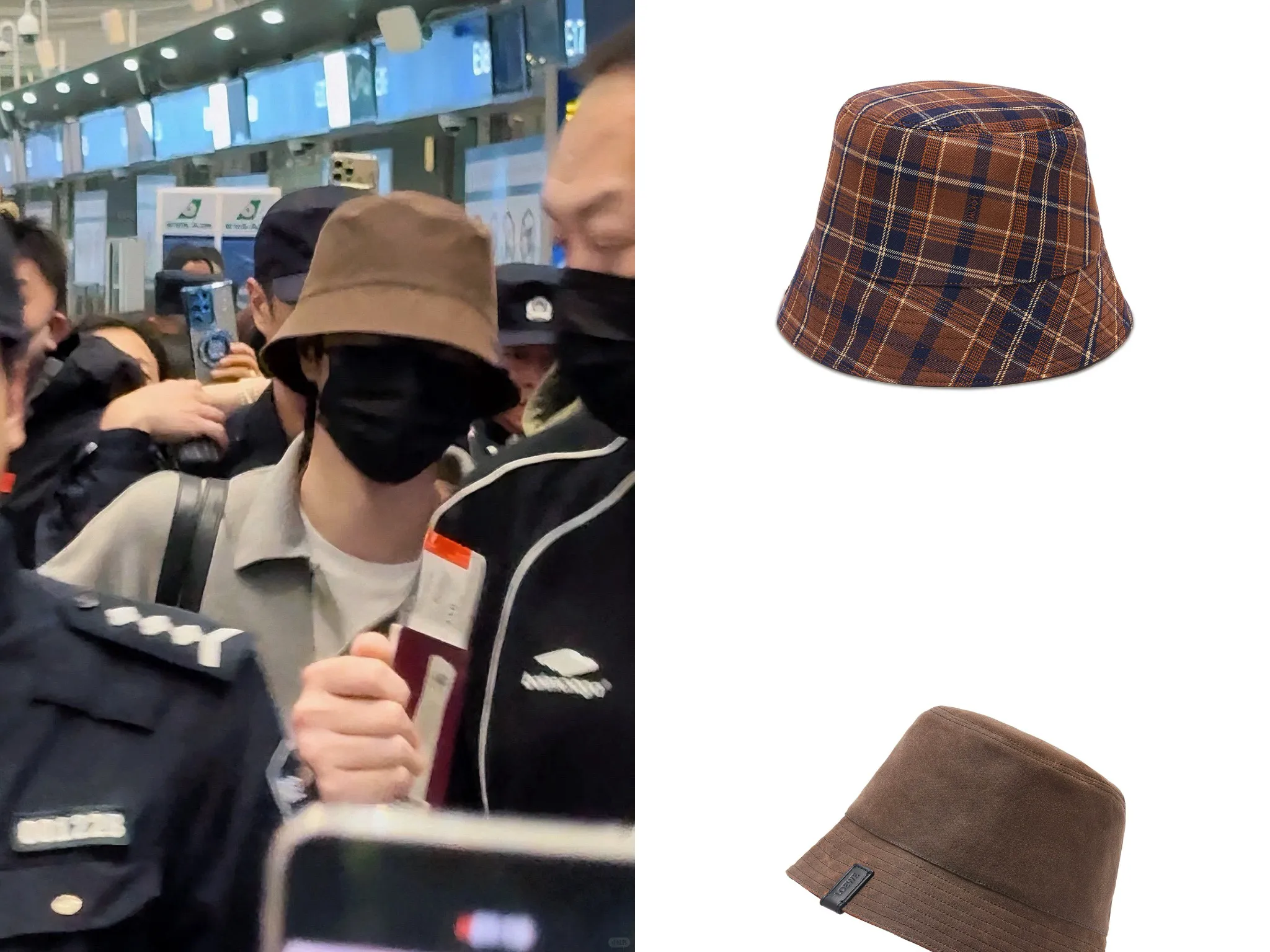 王一博今日份机场造型,一整个all罗意威休闲style,帽子来自罗意威经典的水桶帽,正面蜡质帆布,反面格子泥,双面可翻转。