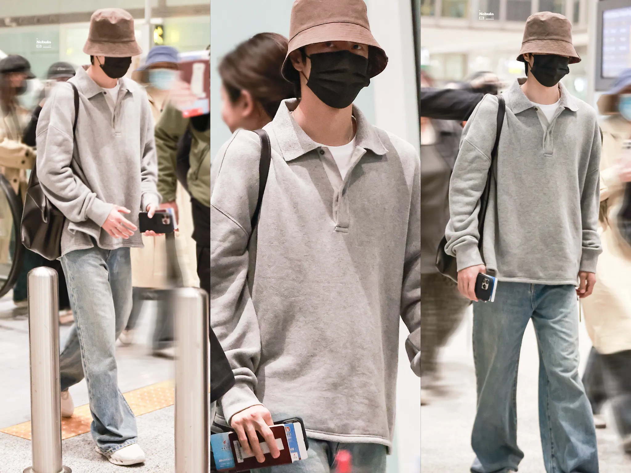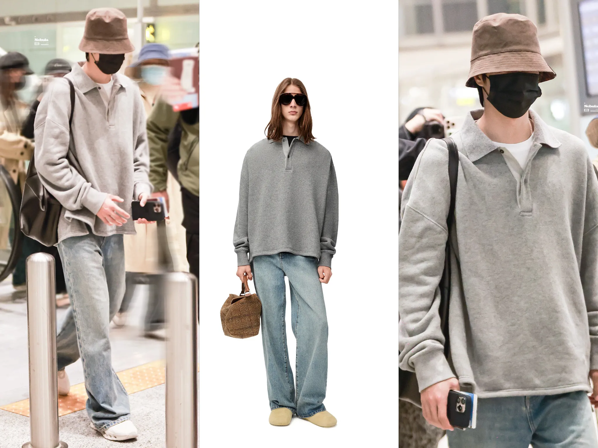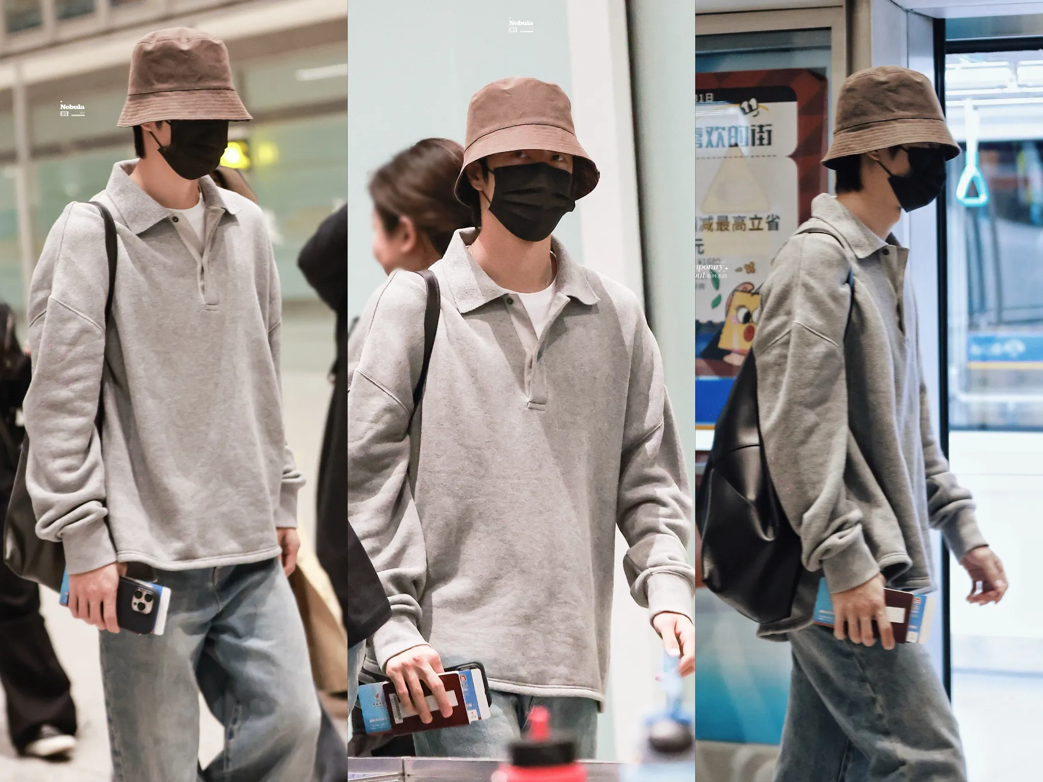 王一博今日份机场造型,一整个all罗意威休闲style,帽子来自罗意威经典的水桶帽,正面蜡质帆布,反面格子泥,双面可翻转。