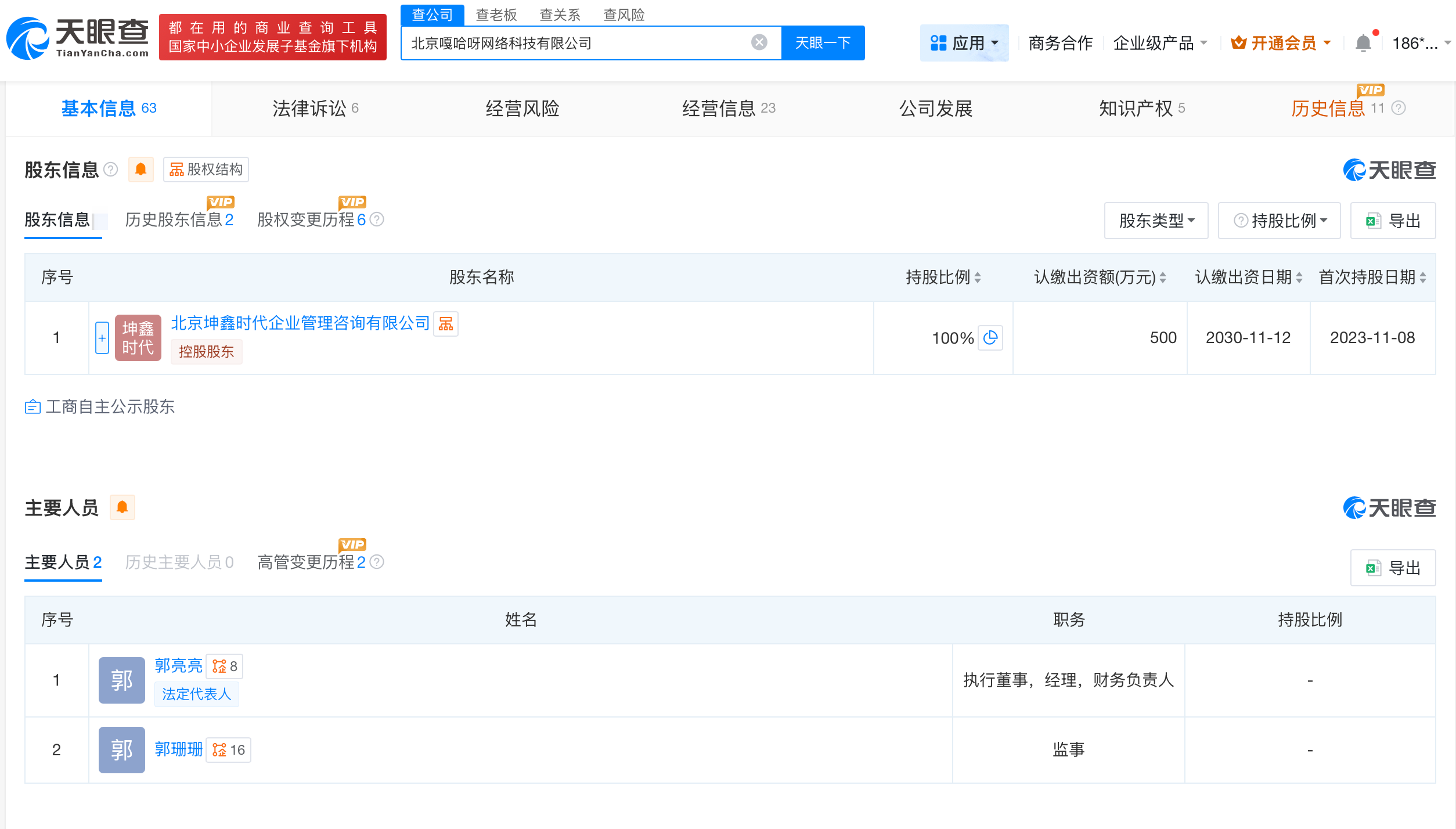 北京嘎哈呀网络科技有限公司成立于2021年12月,法定代表人为郭亮亮,由郭珊珊(嘎子哥妻子)担任监事,注册资本500万人民币,经营范围包括社会经济咨询服务、企业管理咨询、礼仪服务等。股东信息显示,该公司由北京坤鑫时代企业管理咨询有限公司全资持股。