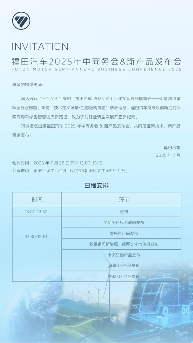 上半年在新能源赛道的强势领跑,不仅为福田汽车积累了坚实底气,更让其绿色转型的步伐愈发坚定。而这一系列成果,只是其绿色跃迁征程的序章。7月28日,一场聚焦绿色未来的行业盛典——福田汽车新品发布会即将震撼启幕,六大新能源新品将集体亮相,用技术突破与场景创新延续上半年的强劲势头,为商用车行业带来一场绿色升级的盛宴。