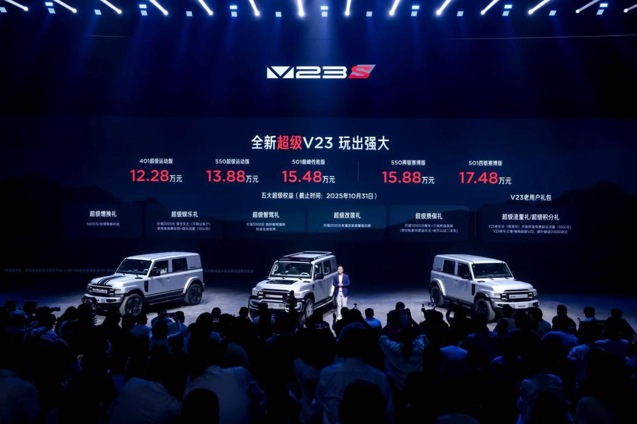全新超级V23不仅外观风格独特,更在性能、操控和越野方面全面进化。动力大幅提升,两驱版最大功率185kW,四驱巅峰性能版最大功率高达455马力,零百加速仅需4.5秒,推背感十足。搭载80.16kWh大电池,支持2.2C快充,续航和充电都很给力。