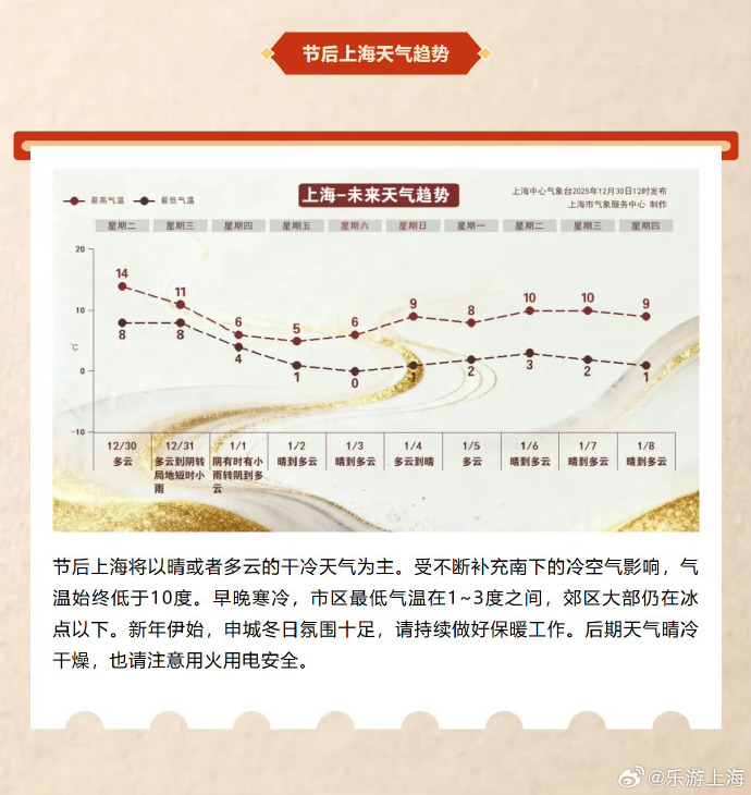 明天白天最高气温尚有11度,夜间气温在8度以下,跨年夜户外活动请注意防寒保暖。