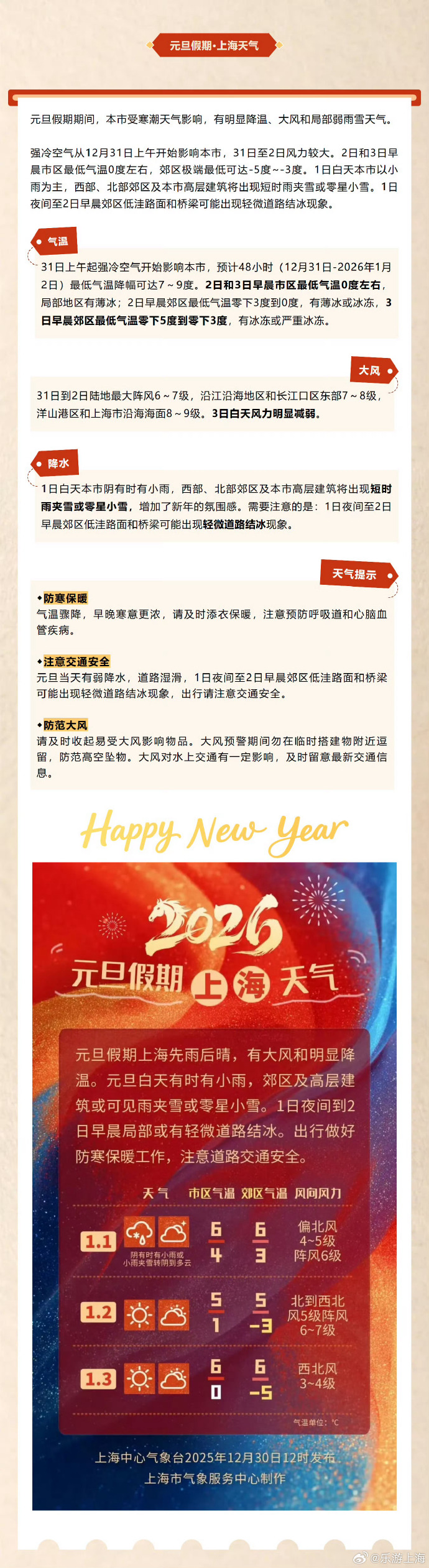 上午起寒潮天气跨年而来,本市将出现大风、明显降温和弱雨雪天气过程。