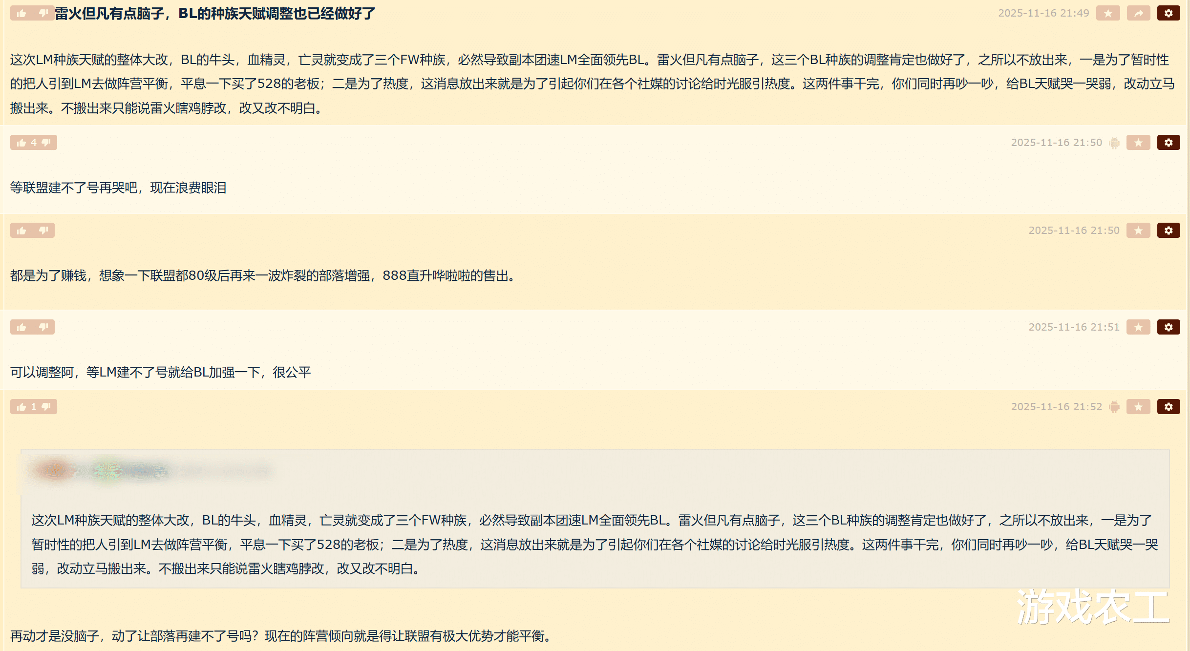 而这次雷火干了什么呢?周五的时候引起了很多玩家的不满,而雷火直接在今天临时进行优化了种族特长的平衡。而这次优化其实很简单,总结就是一句话:以前玩家们不是不喜欢联盟,不喜欢的原因无非就是因为种族特长。既然不喜欢,那么这次雷火直接优化了联盟的种族特长,让这个特长优于部落,这样很多玩家就会回流到联盟了。