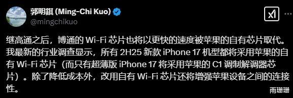 说到iPhone17系列,那可就更精彩了!据说,iPhone17Air也用C1芯片,跟iPhone16e一样。你想啊,iPhone17Air这手机那么薄,才5.5mm,电池空间肯定小,用省电的C1芯片,保证续航妥妥的。但iPhone17、iPhone17Pro、iPhone17ProMax就不一样了,它们用的是更高级的C2芯片!