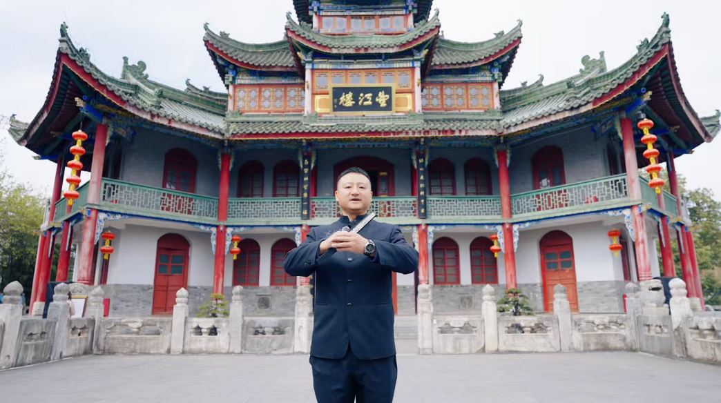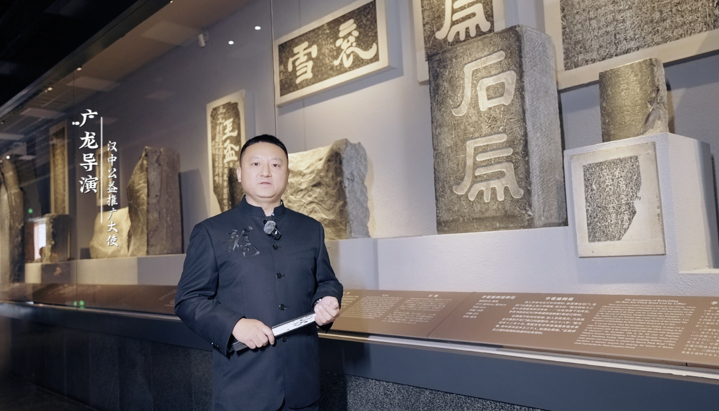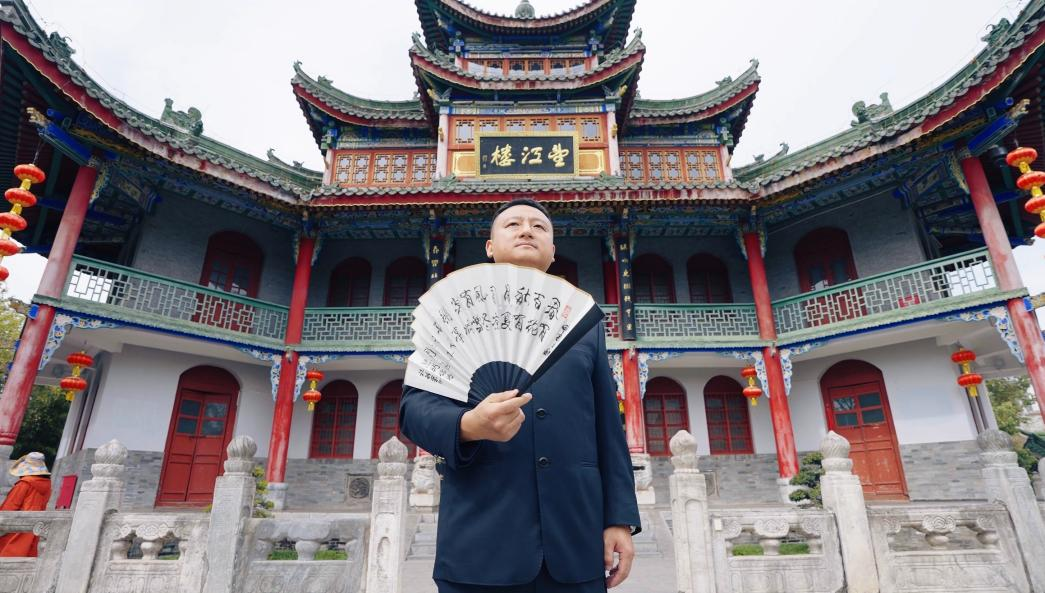 古汉台作为刘邦建立汉朝的发祥地,被誉为“汉家发祥地”,这里留存着望江楼、石门十三品等珍贵文化遗产,是承载汉文化根脉的重要场所。活动当天,广龙导演身着中式立领服装,手持折扇与讲解器,先后探访望江楼、汉台石刻展区等核心点位。在望江楼前,他驻足凝望飞檐翘角,向镜头娓娓道来汉中作为“汉人老家”的历史渊源;在博物馆内,他围绕“石门十三品”等国宝级文物,细致解读汉代书法艺术与栈道文化的独特魅力。