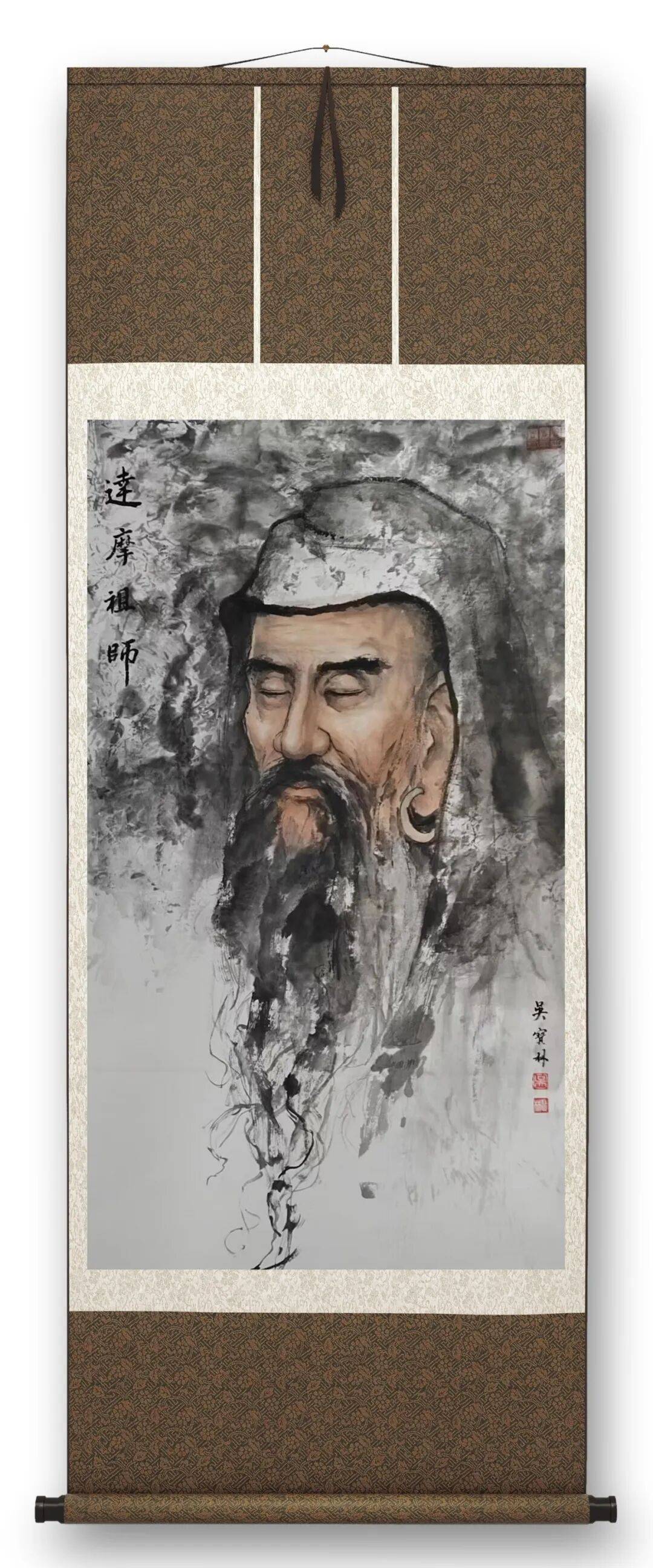 佛画之魂,在于法相传神,更在于精神共鸣。吴宝林深谙此道,摒弃了传统佛画中常见的符号化表达,转而从生命体验中萃取佛性内核。他以寺院修行的亲身经历为铺垫,将吃斋念佛、参禅打坐的体悟融入笔墨,使笔下高僧形象不再是高悬于庙堂的抽象符号,而是兼具神性与人性的鲜活生命。达摩的沉静坚毅、六祖的通透豁达、虚云法师的慈悲厚重,皆通过精准的神态刻画跃然纸上——眉峰的微蹙藏着顿悟前的沉吟,眼眸的澄澈映照着禅心的通透,衣袂的流转暗含着佛法的灵动。这种传神的刻画,源于创作者对宗教精神的深刻理解,更源于对人性本真的细腻洞察,让观者在凝视画作时,能瞬间穿越笔墨的阻隔,与画中人物的精神世界产生共鸣。