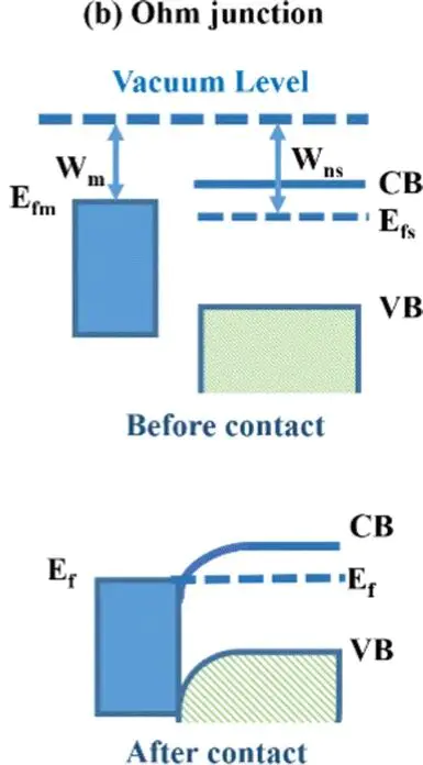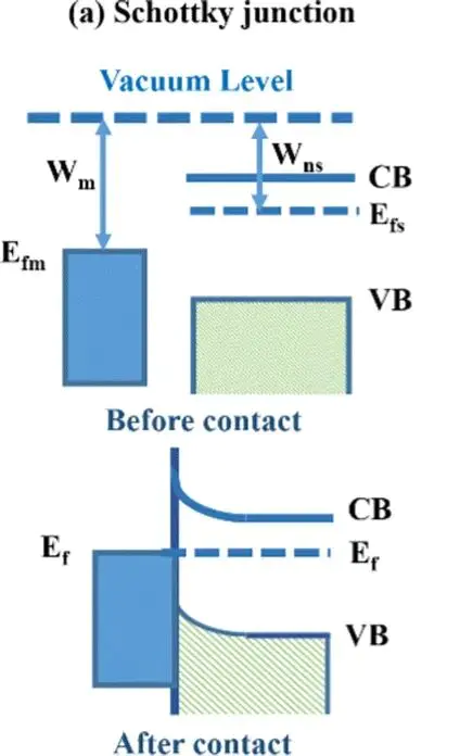 金属的功函数通常介于型半导体功函数与p型半导体功函数之间。当金属与半导体接触时,电子从功函数小的一侧流向功函数大的一侧,空穴则向相反方向移动功函数较小的半导体中的电子转移至金属后,空穴留在半导体中,导致金属表面积累负电荷、半导体表面积累正电荷,使能带向上弯曲,形成肖特基势垒。