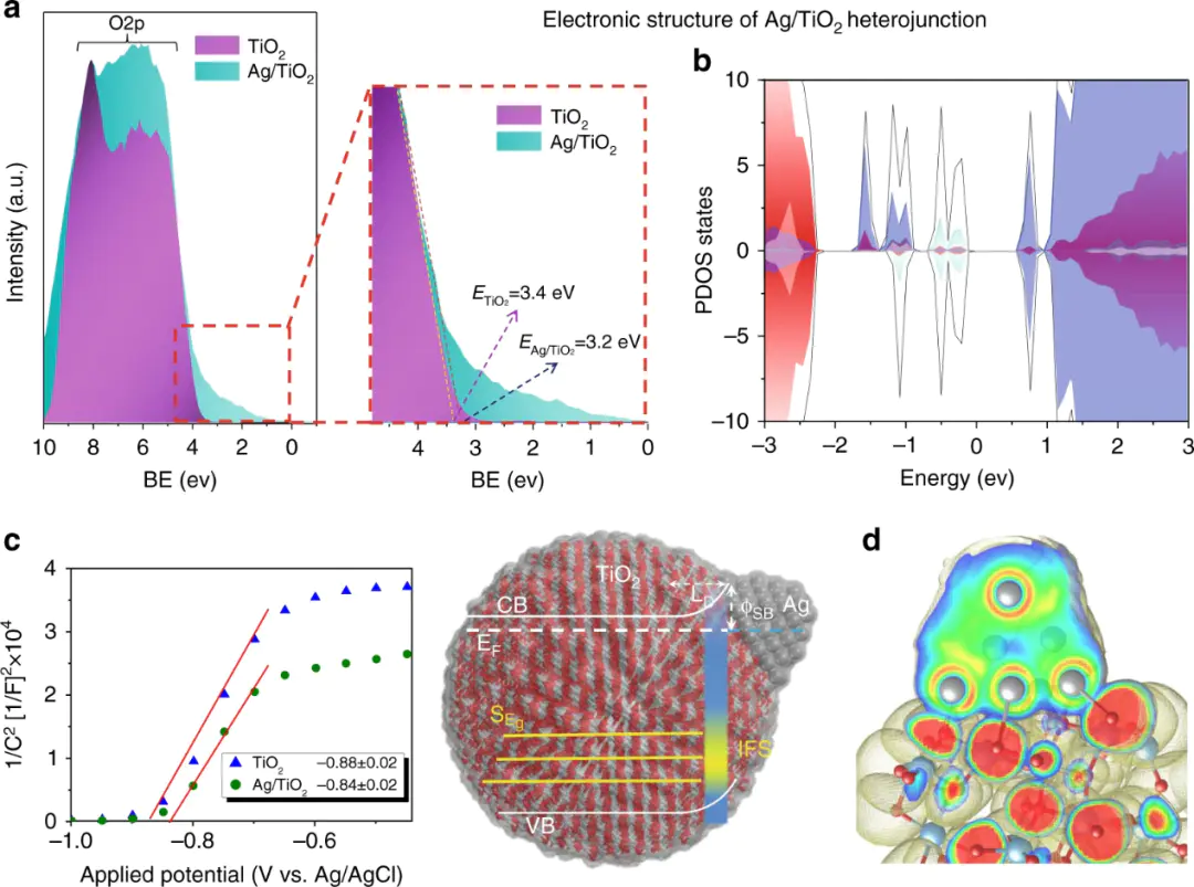 图5.构建异质结可促进光催化反应并提升电荷分离效率。在S-M异质结界面,电子从费米能级较高的半导体流向费米能级较低的类金属助催化剂,最终达到费米能级平衡,。