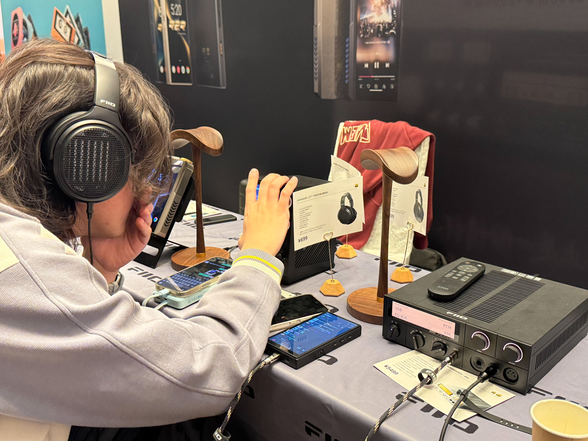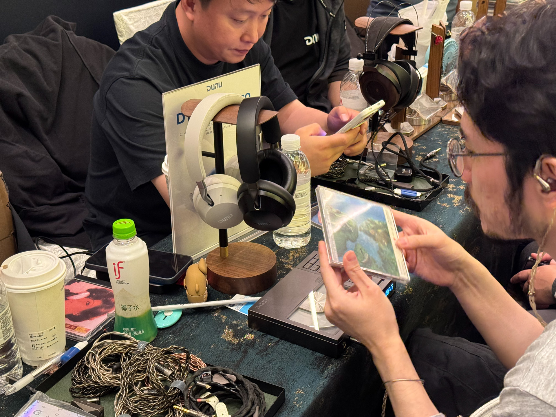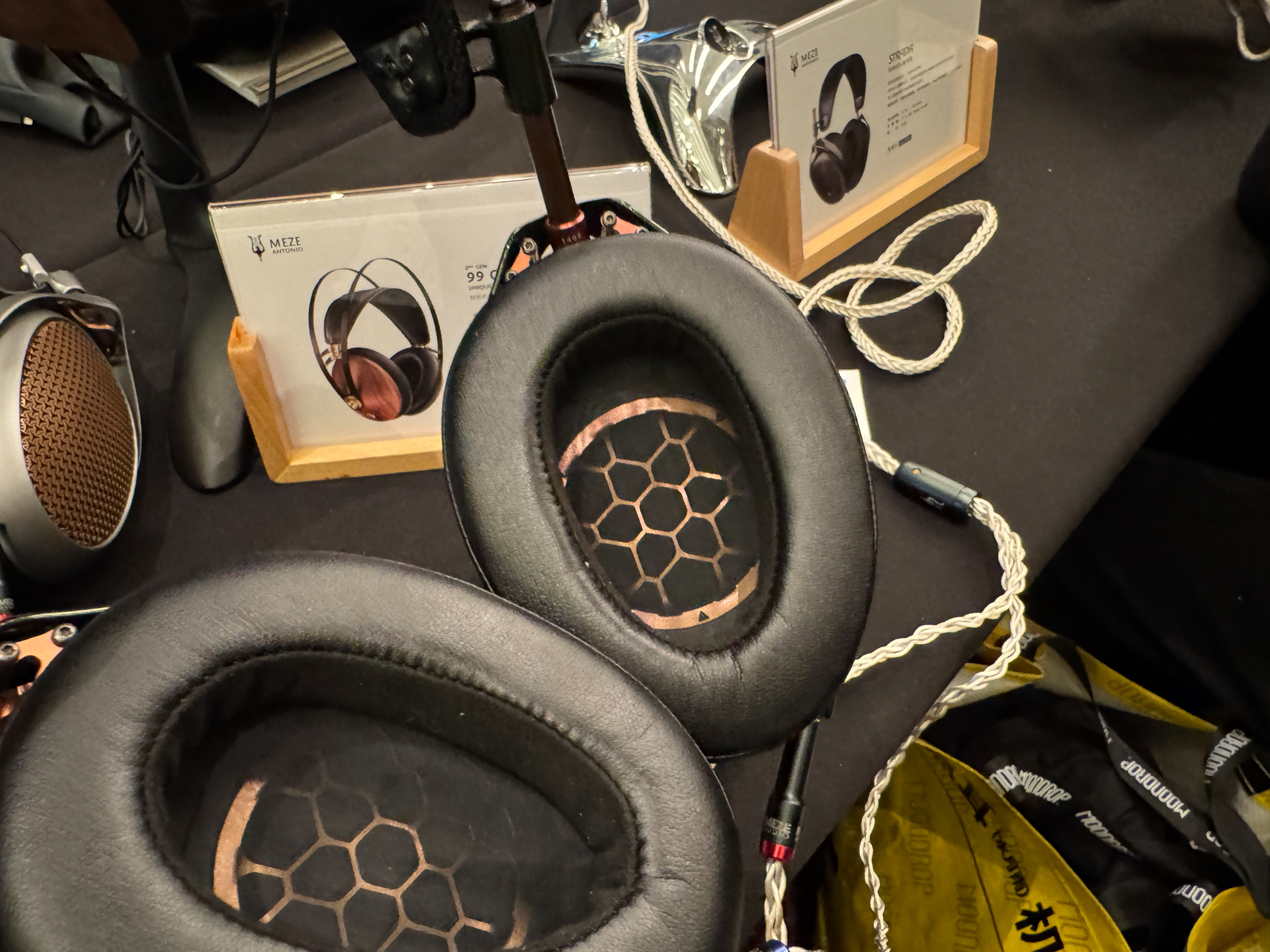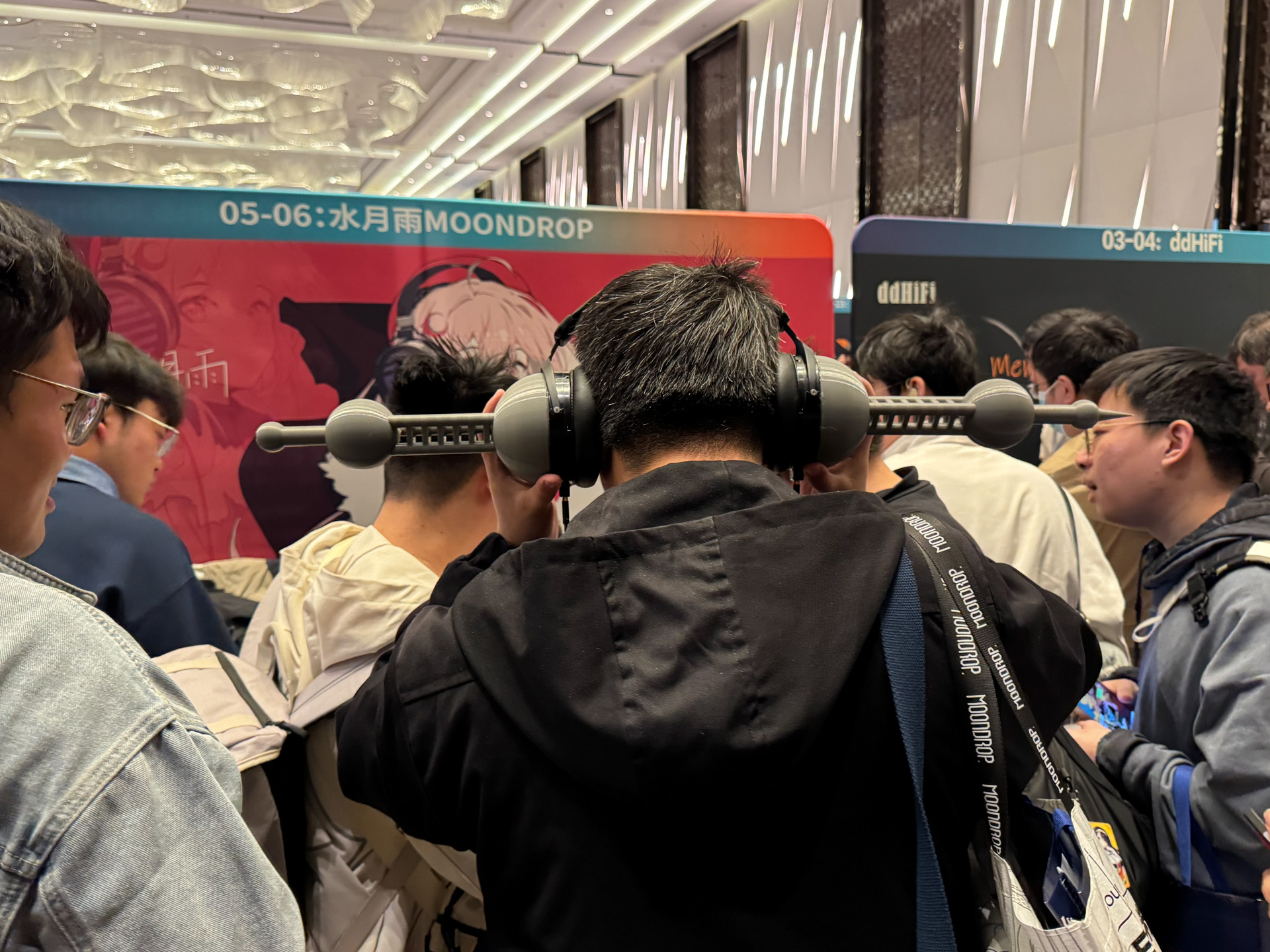 达音科展位上,同业好友表示非常喜欢右边那个大耳机,没记错的话是叫岚。
